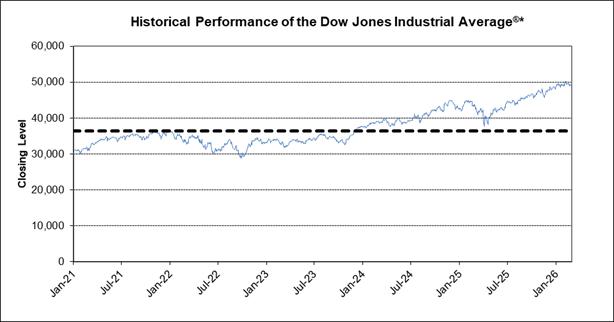 The following graph sets forth daily closing levels of the INDU Index for the period from January 1, 2021 to March 3, 2026. The closing level on March 3, 2026 was 48,501.27.