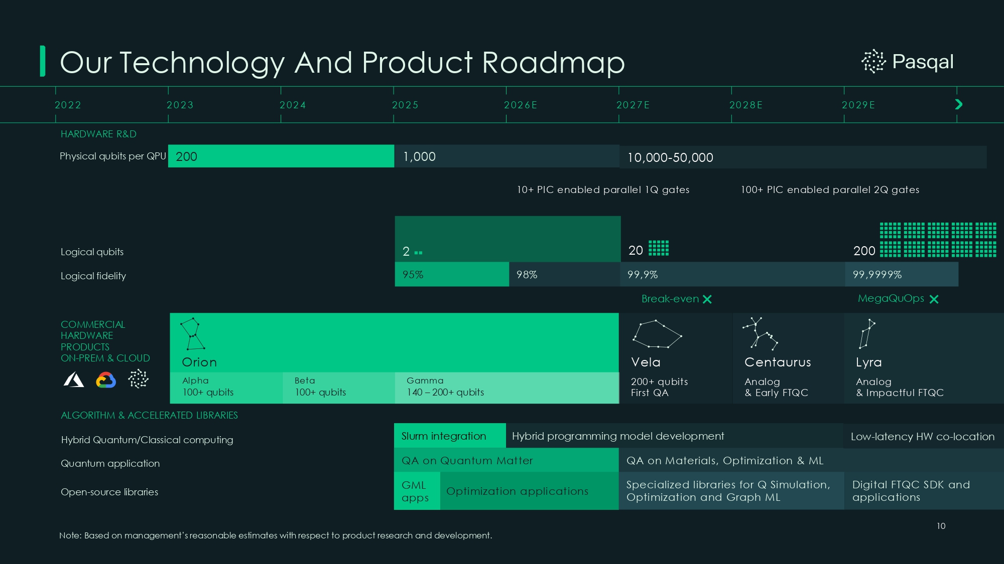 Our Technology And Product Roadmap Orion HARDWARE R&D COMMERCIAL HARDWARE PRODUCTS ON - PREM & CLOUD Physical qubits per QPU Logical qubits Logical fidelity 95% 98% 99,9% 99,9999% ALGORITHM & ACCELERATED LIBRARIES Beta 100+ qubits Alpha 100+ qubits Gamma 140 – 200+ qubits Vela 200+ qubits First QA Centaurus Analog & Early FTQC Lyra Analog & Impactful FTQC Open - source libraries Quantum application 2022 2023 2024 2025 2026E 2027E 2028E 2029E Break - even MegaQuOps 2 20 200 QA on Quantum Matter QA on Materials, Optimization & ML Optimization applications Specialized libraries for Q Simulation, Optimization and Graph ML GML apps Digital FTQC SDK and applications 10+ PIC enabled parallel 1Q gates 100+ PIC enabled parallel 2Q gates Hybrid Quantum/Classical computing Slurm integration Hybrid programming model development Low - latency HW co - location 200 1,000 10,000 - 50,000 10 Note: Based on management’s reasonable estimates with respect to product research and development.