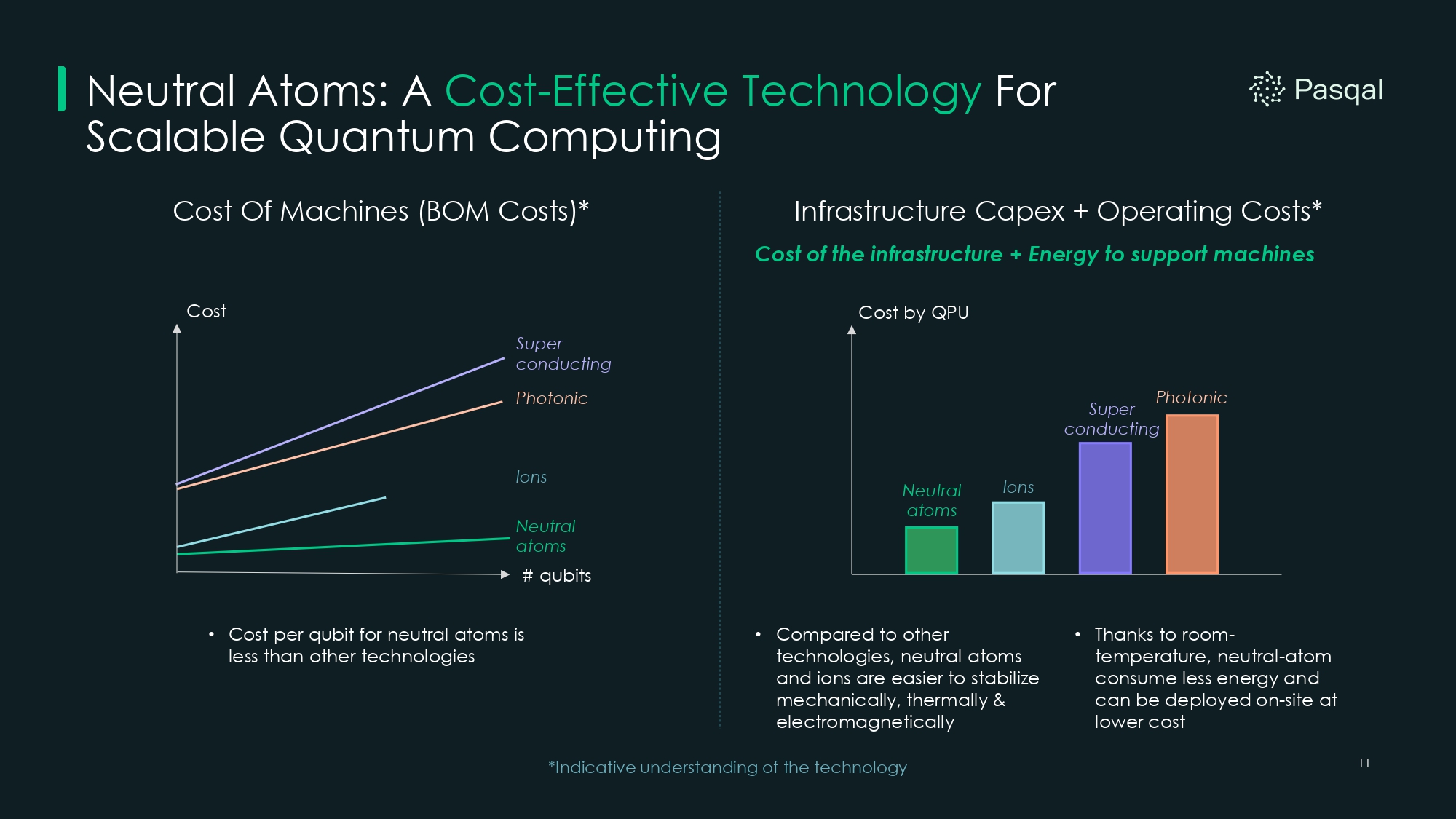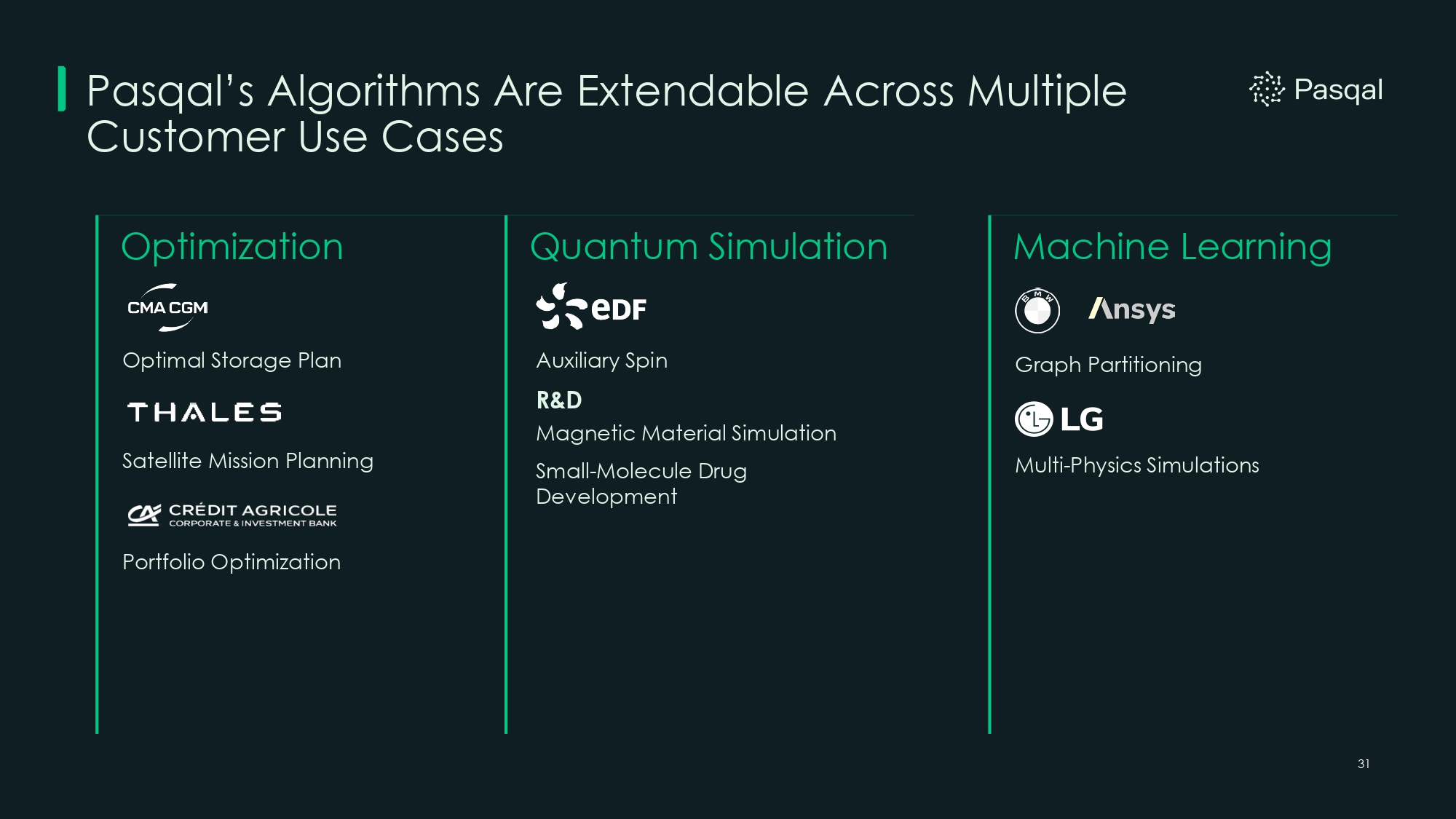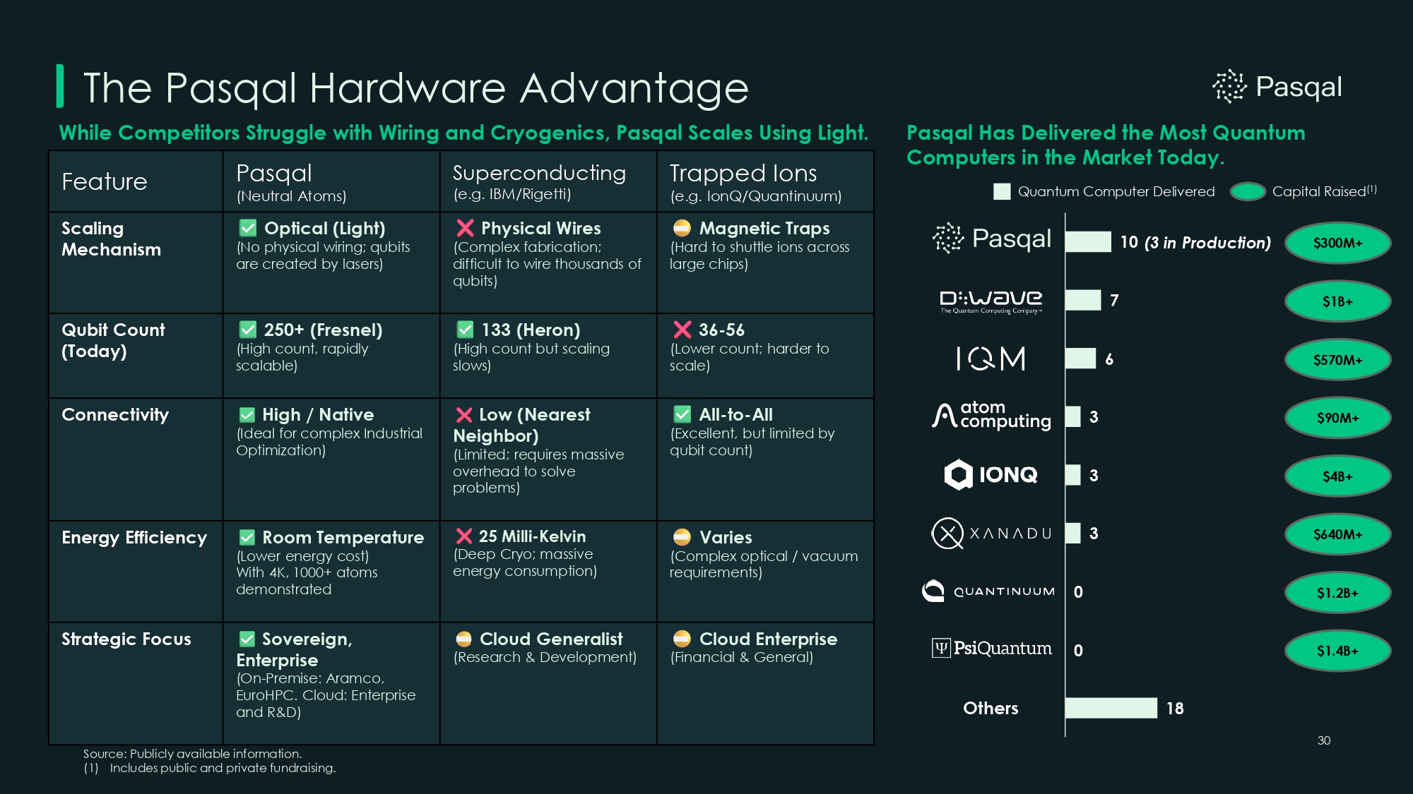 30 Trapped Ions (e.g. IonQ/Quantinuum) Superconducting (e.g. IBM/Rigetti) Pasqal (Neutral Atoms) Feature Magnetic Traps (Hard to shuttle ions across large chips) Physical Wires (Complex fabrication; difficult to wire thousands of qubits) Optical (Light) (No physical wiring; qubits are created by lasers) Scaling Mechanism 36 - 56 (Lower count; harder to scale) 133 (Heron) (High count but scaling slows) 250+ (Fresnel) (High count, rapidly scalable) Qubit Count (Today) All - to - All (Excellent, but limited by qubit count) Low (Nearest Neighbor) (Limited; requires massive overhead to solve problems) High / Native (Ideal for complex Industrial Optimization) Connectivity Varies (Complex optical / vacuum requirements) 25 Milli - Kelvin (Deep Cryo; massive energy consumption) Room Temperature (Lower energy cost) With 4K, 1000+ atoms demonstrated Energy Efficiency Cloud Enterprise (Financial & General) Cloud Generalist (Research & Development) Sovereign, Enterprise (On - Premise: Aramco, EuroHPC. Cloud: Enterprise and R&D) Strategic Focus The Pasqal Hardware Advantage While Competitors Struggle with Wiring and Cryogenics, Pasqal Scales Using Light. Source: Publicly available information. (1) Includes public and private fundraising. 7 6 3 3 3 0 0 18 10 (3 in Production) Others $300M+ Pasqal Has Delivered the Most Quantum Computers in the Market Today. Quantum Computer Delivered Capital Raised (1) $1B+ $570M+ $90M+ $4B+ $640M+ $1.2B+ $1.4B+