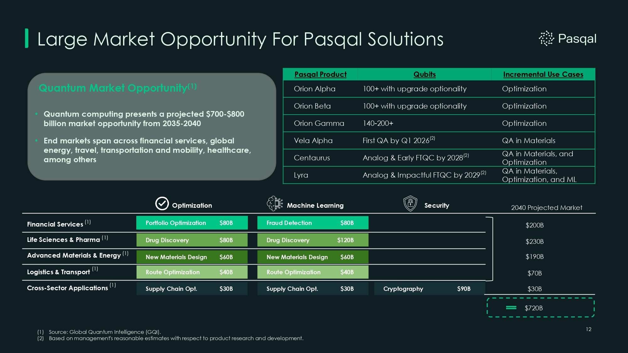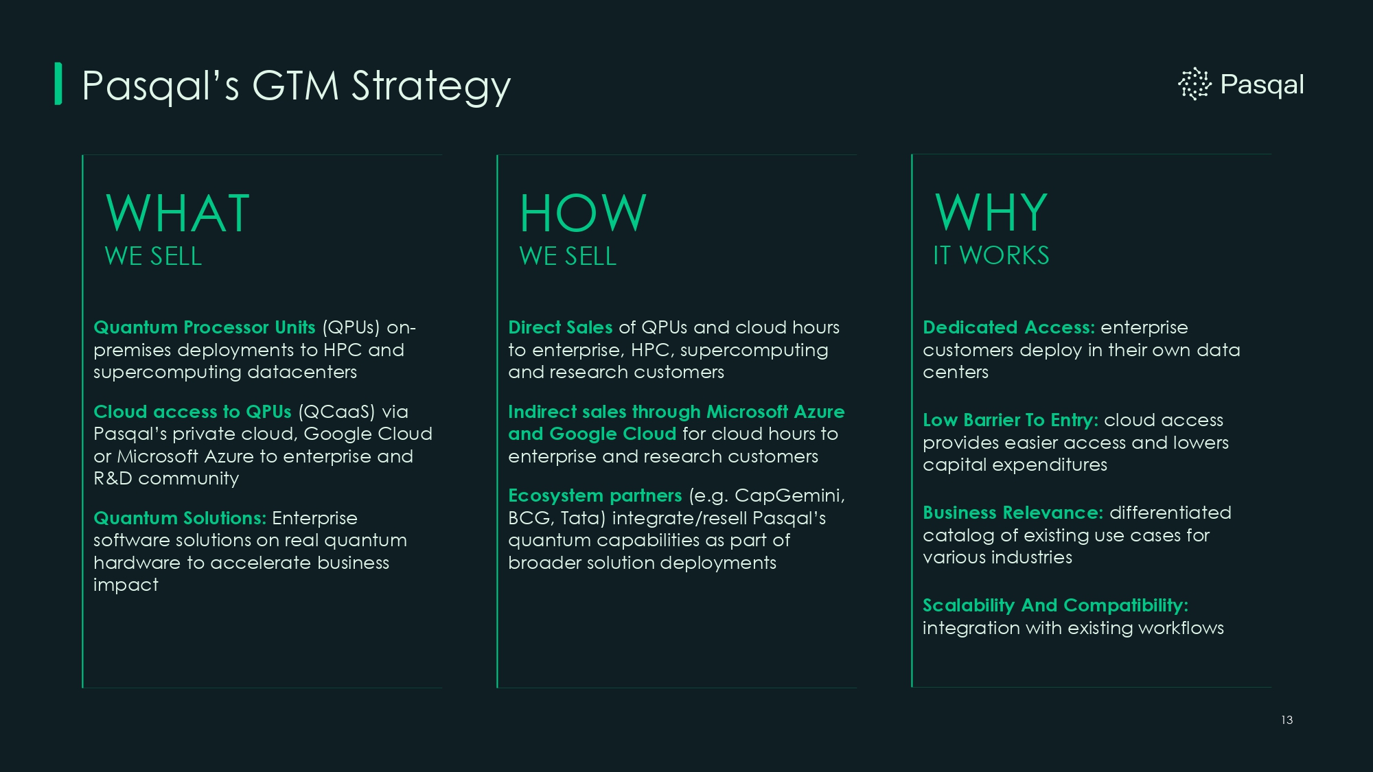 Large Market Opportunity For Pasqal Solutions 12 Quantum Market Opportunity (1) • Quantum computing presents a projected $700 - $800 billion market opportunity from 2035 - 2040 • End markets span across financial services, global energy, travel, transportation and mobility, healthcare, among others Portfolio Optimization $80B Supply Chain Opt. $30B Route Optimization $40B Drug Discovery $80B New Materials Design $60B Cryptography $90B Optimization Security 2040 Projected Market $200B $230B $190B $70B $30B $720B Incremental Use Cases Qubits Pasqal Product Optimization 100+ with upgrade optionality Orion Alpha Optimization 100+ with upgrade optionality Orion Beta Optimization 140 - 200+ Orion Gamma QA in Materials First QA by Q1 2026 (2) Vela Alpha QA in Materials, and Optimization Analog & Early FTQC by 2028 (2) Centaurus QA in Materials, Optimization, and ML Analog & Impactful FTQC by 2029 (2) Lyra (1) Source: Global Quantum Intelligence (GQI). (2) Based on management's reasonable estimates with respect to product research and development. Financial Services (1) Life Sciences & Pharma (1) Advanced Materials & Energy (1) Logistics & Transport (1) Cross - Sector Applications (1) Machine Learning Fraud Detection $80B Drug Discovery $120B New Materials Design $60B Route Optimization $40B Supply Chain Opt. $30B