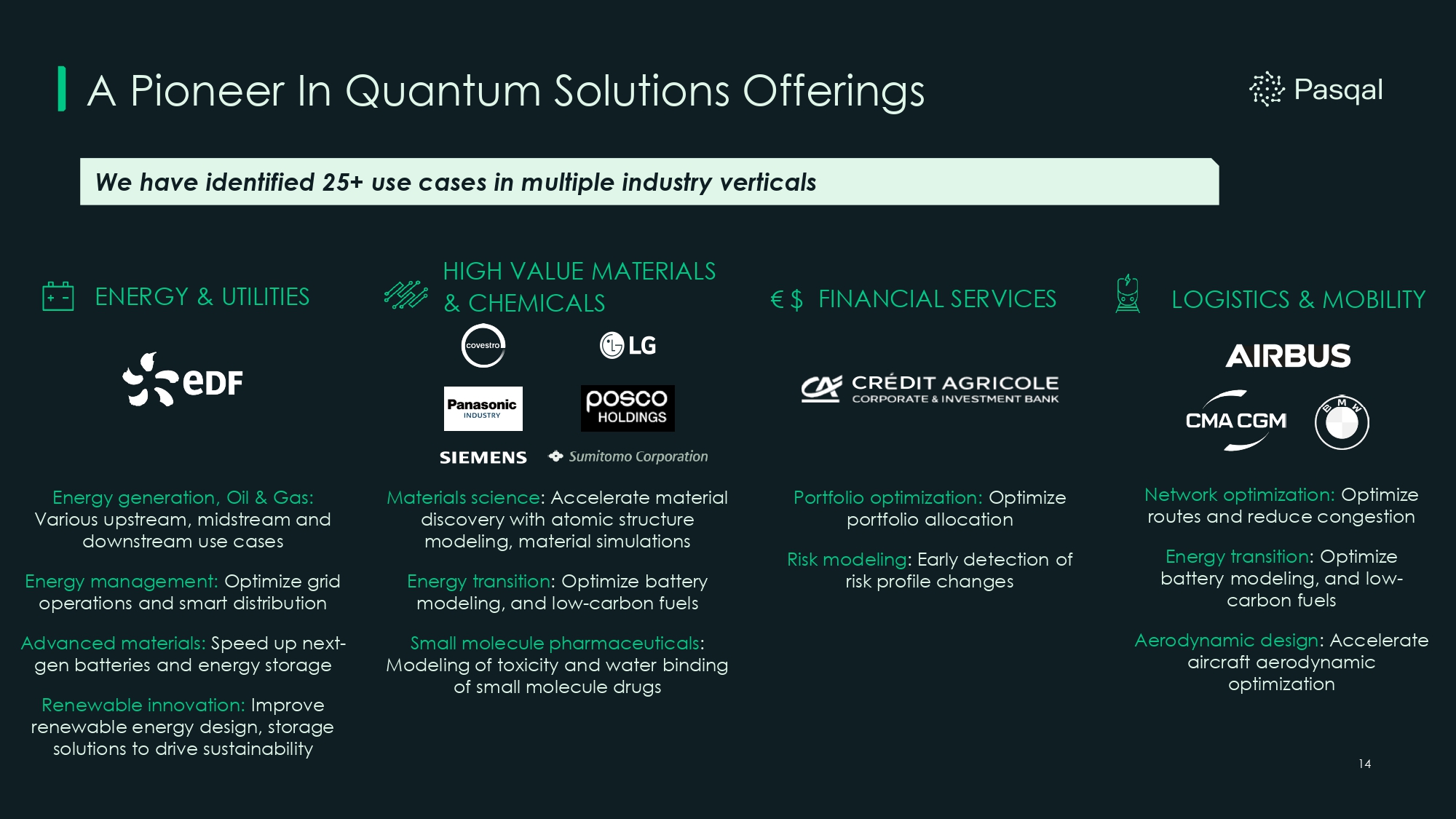 13 Pasqal’s GTM Strategy HOW WE SELL Direct Sales of QPUs and cloud hours to enterprise, HPC, supercomputing and research customers Indirect sales through Microsoft Azure and Google Cloud for cloud hours to enterprise and research customers Ecosystem partners (e.g. CapGemini, BCG, Tata) integrate/resell Pasqal’s quantum capabilities as part of broader solution deployments WHY IT WORKS Dedicated Access: enterprise customers deploy in their own data centers Low Barrier To Entry : cloud access provides easier access and lowers capital expenditures Business Relevance: differentiated catalog of existing use cases for various industries Scalability And Compatibility: integration with existing workflows WHAT WE SELL Quantum Processor Units (QPUs) on - premises deployments to HPC and supercomputing datacenters Cloud access to QPUs (QCaaS) via Pasqal’s private cloud, Google Cloud or Microsoft Azure to enterprise and R&D community Quantum Solutions: Enterprise software solutions on real quantum hardware to accelerate business impact