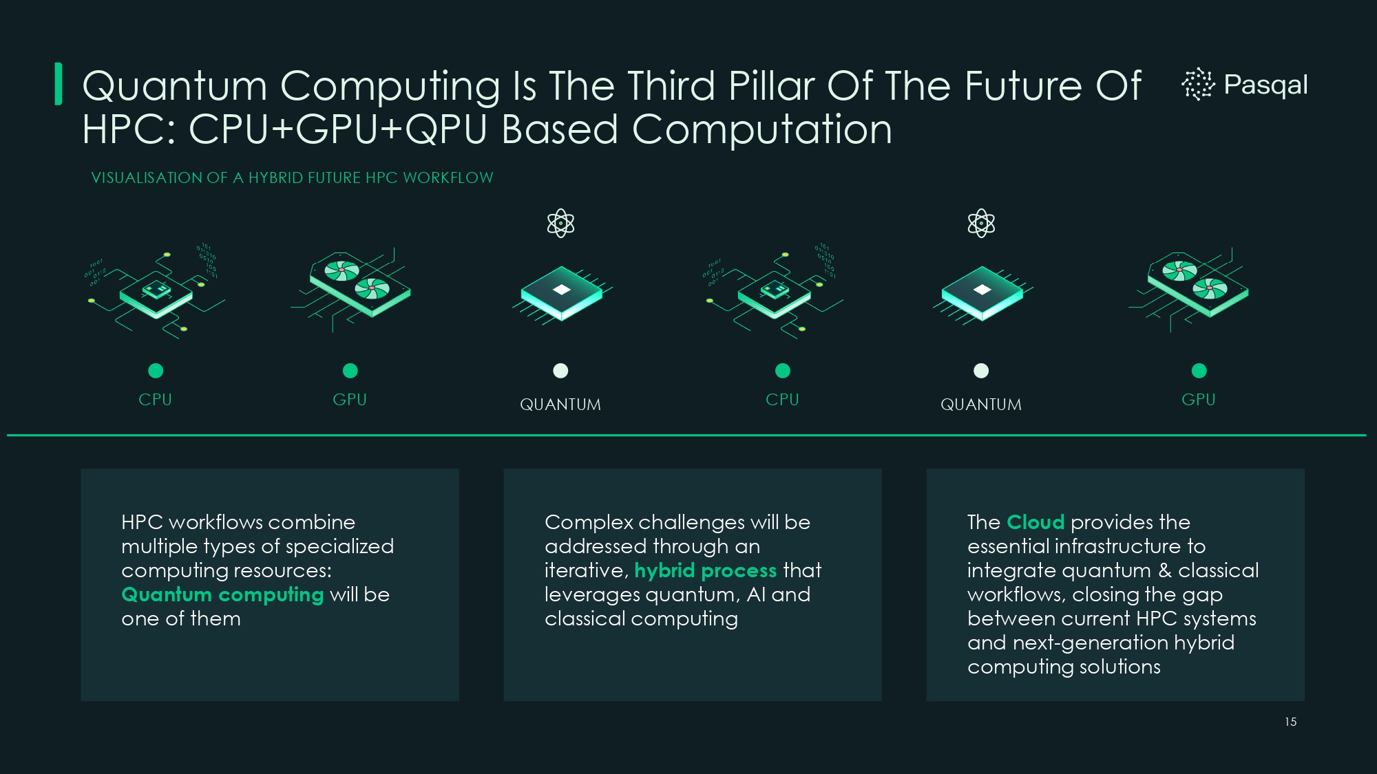 15 Quantum Computing Is The Third Pillar Of The Future Of HPC: CPU+GPU+QPU Based Computation VISUALISATION OF A HYBRID FUTURE HPC WORKFLOW CPU GPU CPU GPU QUANTUM HPC workflows combine multiple types of specialized computing resources: Quantum computing will be one of them Complex challenges will be addressed through an iterative, hybrid process that leverages quantum, AI and classical computing The Cloud provides the essential infrastructure to integrate quantum & classical workflows, closing the gap between current HPC systems and next - generation hybrid computing solutions QUANTUM 15