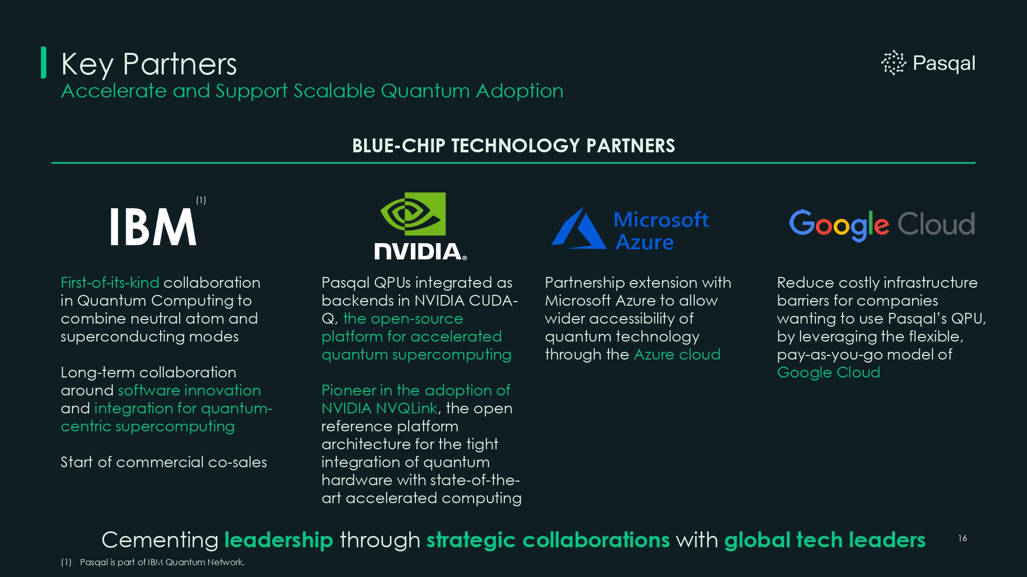 First - of - its - kind collaboration in Quantum Computing to combine neutral atom and superconducting modes Long - term collaboration around software innovation and integration for quantum - centric supercomputing Start of commercial co - sales 16 Key Partners Accelerate and Support Scalable Quantum Adoption Pasqal QPUs integrated as backends in NVIDIA CUDA - Q, the open - source platform for accelerated quantum supercomputing Pioneer in the adoption of NVIDIA NVQLink , the open reference platform architecture for the tight integration of quantum hardware with state - of - the - art accelerated computing Partnership extension with Microsoft Azure to allow wider accessibility of quantum technology through the Azure cloud Reduce costly infrastructure barriers for companies wanting to use Pasqal’s QPU, by leveraging the flexible, pay - as - you - go model of Google Cloud BLUE - CHIP TECHNOLOGY PARTNERS IBM Cementing leadership through strategic collaborations with global tech leaders (1) Pasqal is part of IBM Quantum Network. (1)