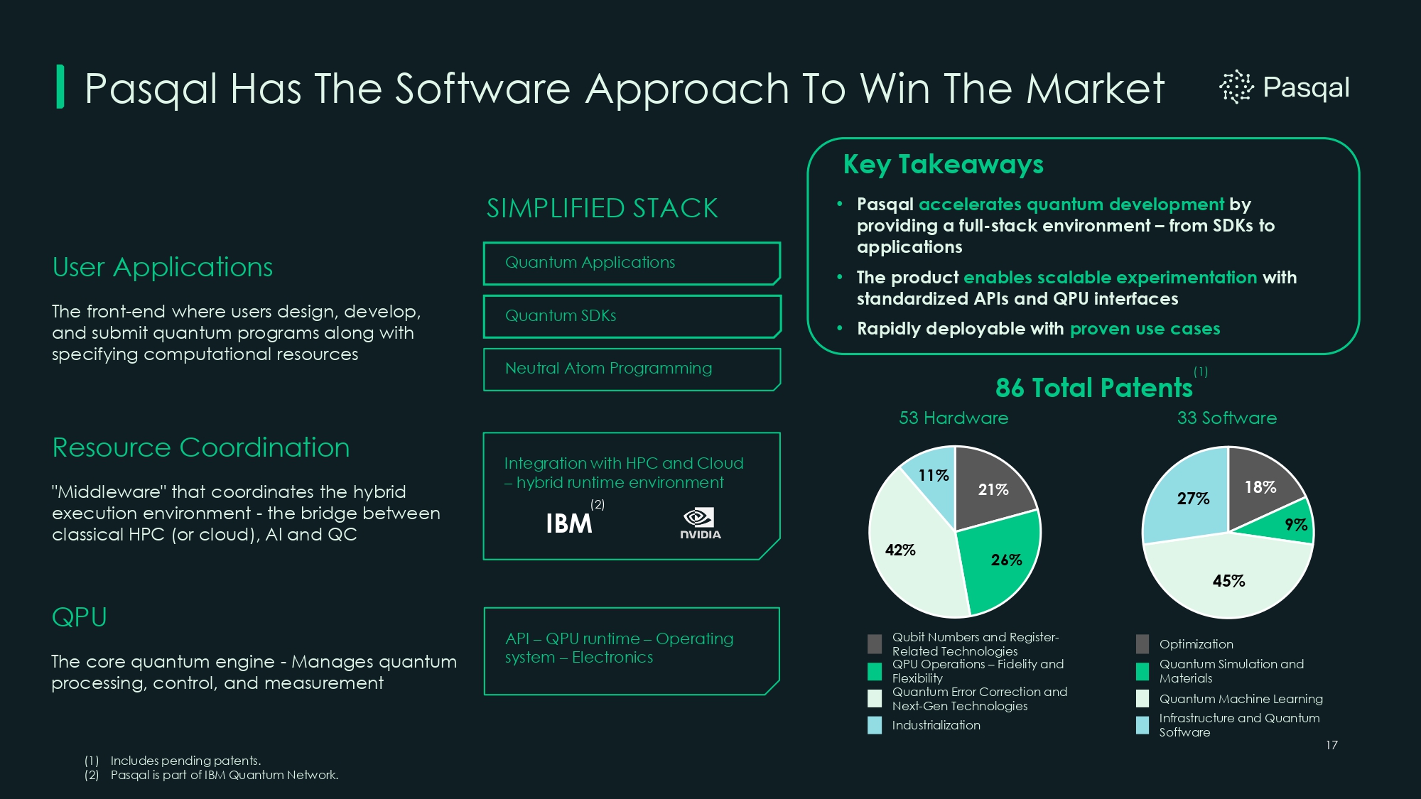 Pasqal Has The Software Approach To Win The Market User Applications The front - end where users design, develop, and submit quantum programs along with specifying computational resources Resource Coordination "Middleware" that coordinates the hybrid execution environment - the bridge between classical HPC (or cloud), AI and QC QPU The core quantum engine - Manages quantum processing, control, and measurement SIMPLIFIED STACK Quantum Applications Quantum SDKs Neutral Atom Programming API – QPU runtime – Operating system – Electronics 17 • Pasqal accelerates quantum development by providing a full - stack environment – from SDKs to applications • The product enables scalable experimentation with standardized APIs and QPU interfaces • Rapidly deployable with proven use cases Key Takeaways 21% 26% 42% 11% 18% 9% 45% 27% Qubit Numbers and Register - Related Technologies QPU Operations – Fidelity and Flexibility Quantum Error Correction and Next - Gen Technologies Industrialization Optimization Quantum Simulation and Materials Quantum Machine Learning Infrastructure and Quantum Software 53 Hardware 33 Software 86 Total Patents (1) Includes pending patents. (2) Pasqal is part of IBM Quantum Network. (1) Integration with HPC and Cloud – hybrid runtime environment (2) IBM