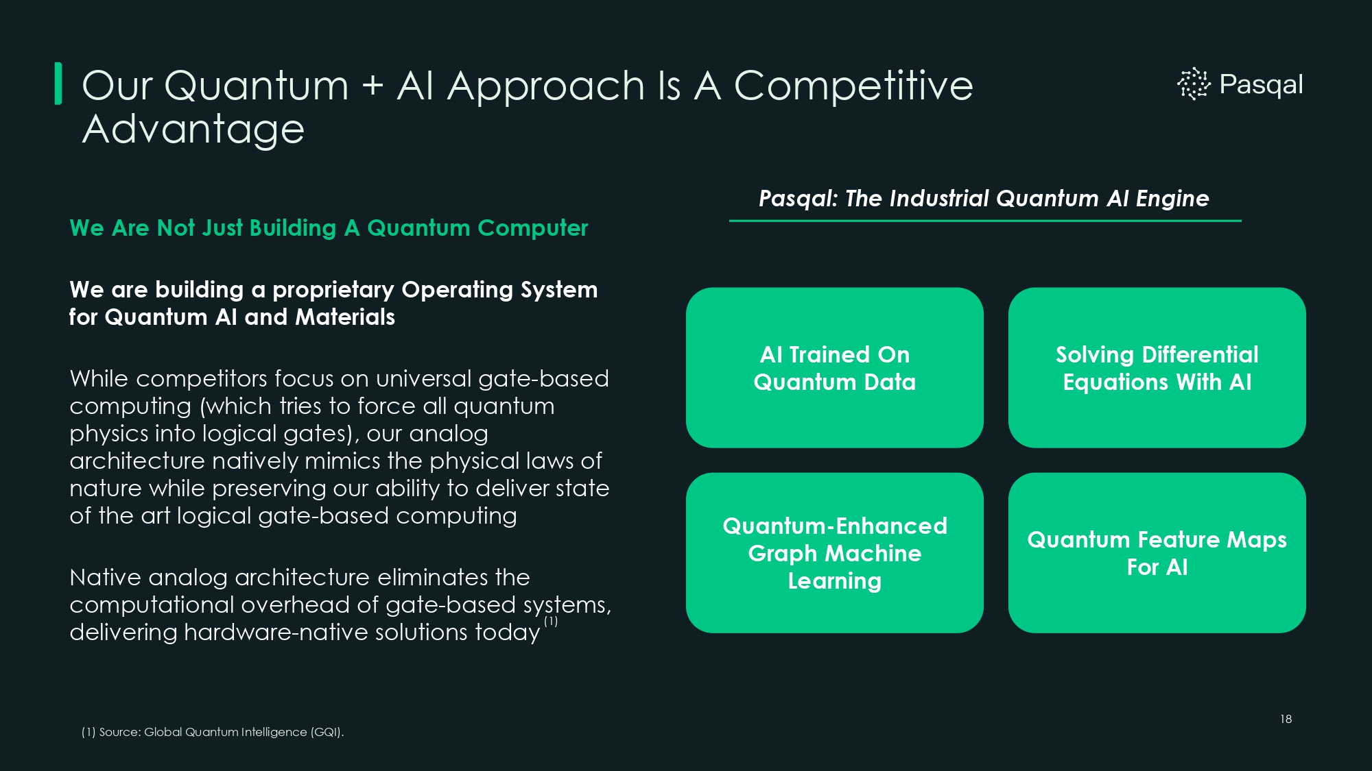 18 Our Quantum + AI Approach Is A Competitive Advantage (1) Source: Global Quantum Intelligence (GQI). AI Trained On Quantum Data Solving Differential Equations With AI Quantum - Enhanced Graph Machine Learning Quantum Feature Maps For AI Pasqal: The Industrial Quantum AI Engine We Are Not Just Building A Quantum Computer We are building a proprietary Operating System for Quantum AI and Materials While competitors focus on universal gate - based computing (which tries to force all quantum physics into logical gates), our analog architecture natively mimics the physical laws of nature while preserving our ability to deliver state of the art logical gate - based computing Native analog architecture eliminates the computational overhead of gate - based systems, delivering hardware - native solutions today (1)