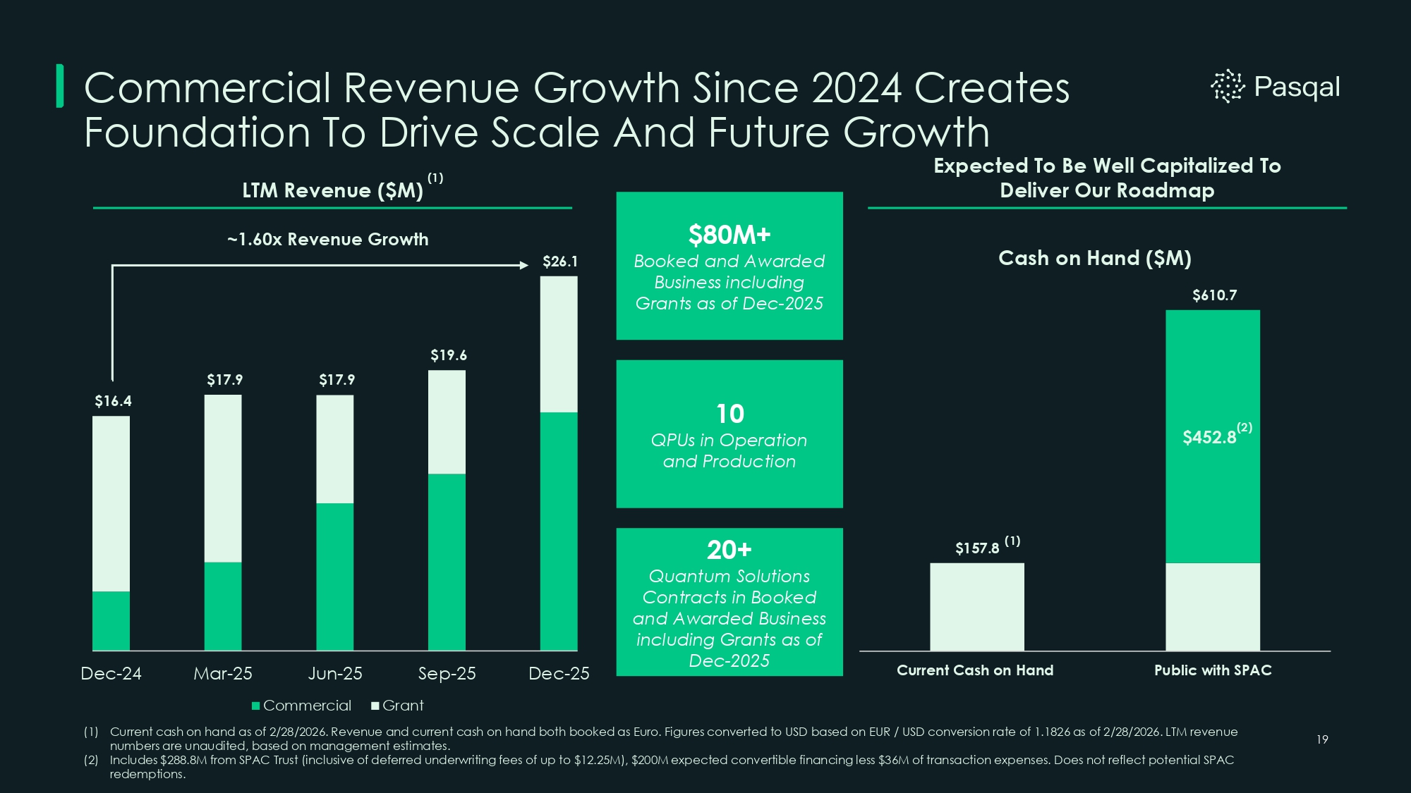 $16.4 $17.9 $17.9 $19.6 $26.1 Dec - 24 Mar - 25 Dec - 25 Jun - 25 Commercial Sep - 25 Grant 19 Commercial Revenue Growth Since 2024 Creates Foundation To Drive Scale And Future Growth ~1.60x Revenue Growth Expected To Be Well Capitalized To Deliver Our Roadmap $610.7 Current Cash on Hand Public with SPAC Cash on Hand ($M) $452.8 (2) (1) Current cash on hand as of 2/28/2026. Revenue and current cash on hand both booked as Euro. Figures converted to USD based on EUR / USD conversion rate of 1.1826 as of 2/28/2026. LTM revenue numbers are unaudited, based on management estimates. (2) Includes $288.8M from SPAC Trust (inclusive of deferred underwriting fees of up to $12.25M), $200M expected convertible financing less $36M of transaction expenses. Does not reflect potential SPAC redemptions. LTM Revenue ($M) $157.8 (1) (1) $80M+ Booked and Awarded Business including Grants as of Dec - 2025 10 QPUs in Operation and Production 20+ Quantum Solutions Contracts in Booked and Awarded Business including Grants as of Dec - 2025
