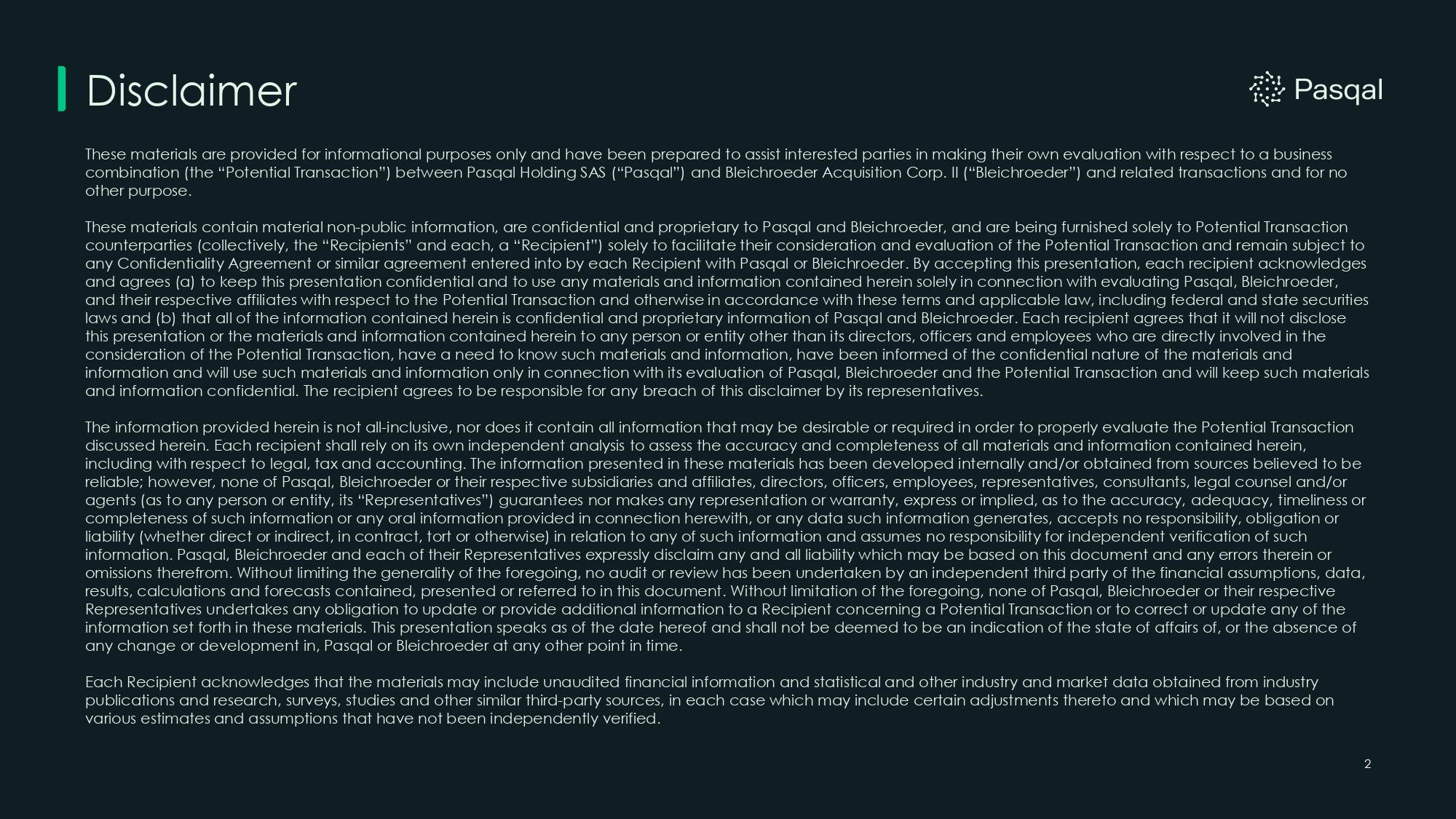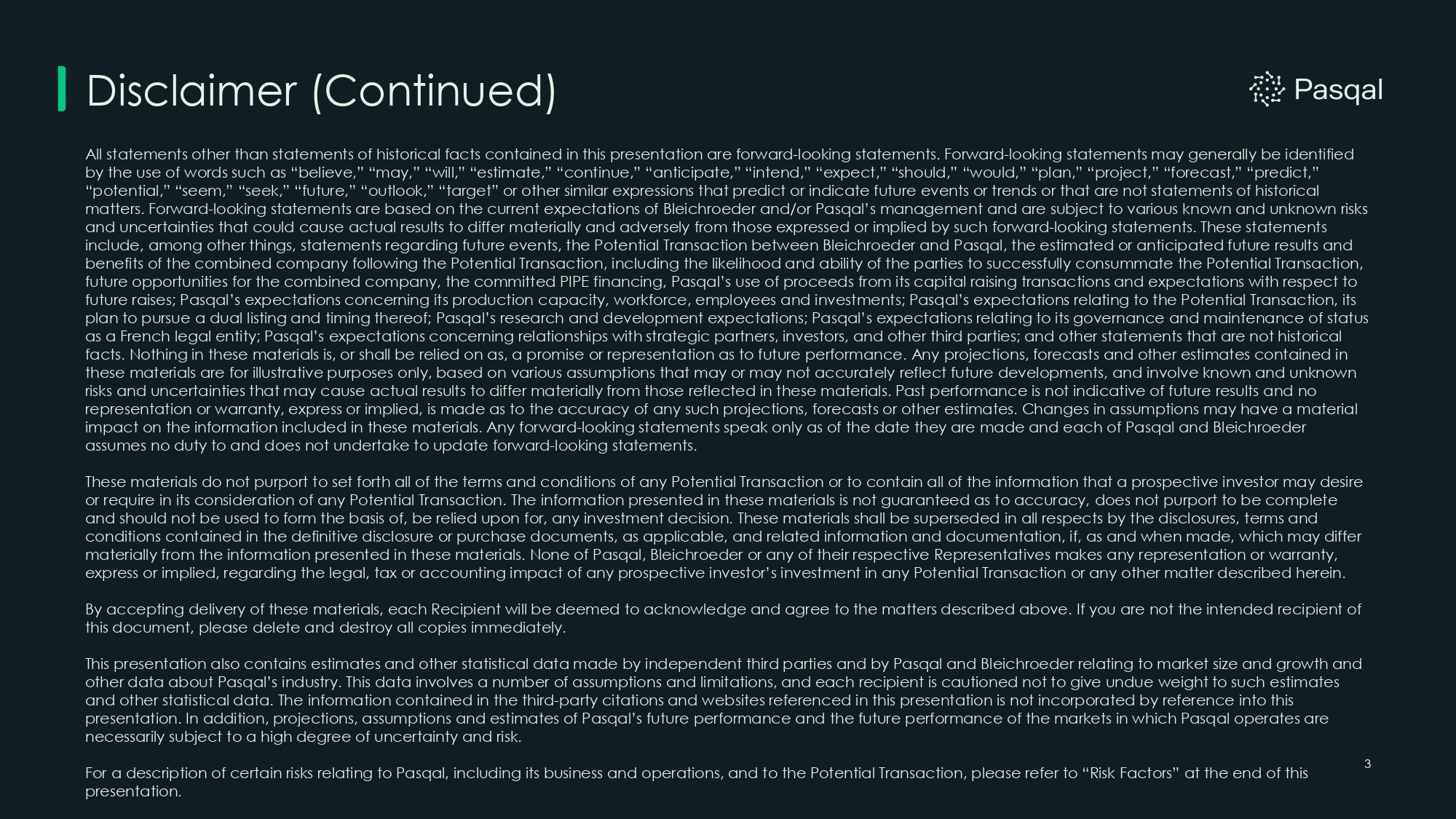 Disclaimer These materials are provided for informational purposes only and have been prepared to assist interested parties in making their own evaluation with respect to a business combination (the “Potential Transaction”) between Pasqal Holding SAS (“Pasqal”) and Bleichroeder Acquisition Corp. II (“Bleichroeder”) and related transactions and for no other purpose. These materials contain material non - public information, are confidential and proprietary to Pasqal and Bleichroeder, and are being furnished solely to Potential Transaction counterparties (collectively, the “Recipients” and each, a “Recipient”) solely to facilitate their consideration and evaluation of the Potential Transaction and remain subject to any Confidentiality Agreement or similar agreement entered into by each Recipient with Pasqal or Bleichroeder. By accepting this presentation, each recipient acknowledges and agrees (a) to keep this presentation confidential and to use any materials and information contained herein solely in connection with evaluating Pasqal, Bleichroeder, and their respective affiliates with respect to the Potential Transaction and otherwise in accordance with these terms and applicable law, including federal and state securities laws and (b) that all of the information contained herein is confidential and proprietary information of Pasqal and Bleichroeder. Each recipient agrees that it will not disclose this presentation or the materials and information contained herein to any person or entity other than its directors, officers and employees who are directly involved in the consideration of the Potential Transaction, have a need to know such materials and information, have been informed of the confidential nature of the materials and information and will use such materials and information only in connection with its evaluation of Pasqal, Bleichroeder and the Potential Transaction and will keep such materials and information confidential. The recipient agrees to be responsible for any breach of this disclaimer by its representatives. The information provided herein is not all - inclusive, nor does it contain all information that may be desirable or required in order to properly evaluate the Potential Transaction discussed herein. Each recipient shall rely on its own independent analysis to assess the accuracy and completeness of all materials and information contained herein, including with respect to legal, tax and accounting. The information presented in these materials has been developed internally and/or obtained from sources believed to be reliable; however, none of Pasqal, Bleichroeder or their respective subsidiaries and affiliates, directors, officers, employees, representatives, consultants, legal counsel and/or agents (as to any person or entity, its “Representatives”) guarantees nor makes any representation or warranty, express or implied, as to the accuracy, adequacy, timeliness or completeness of such information or any oral information provided in connection herewith, or any data such information generates, accepts no responsibility, obligation or liability (whether direct or indirect, in contract, tort or otherwise) in relation to any of such information and assumes no responsibility for independent verification of such information. Pasqal, Bleichroeder and each of their Representatives expressly disclaim any and all liability which may be based on this document and any errors therein or omissions therefrom. Without limiting the generality of the foregoing, no audit or review has been undertaken by an independent third party of the financial assumptions, data, results, calculations and forecasts contained, presented or referred to in this document. Without limitation of the foregoing, none of Pasqal, Bleichroeder or their respective Representatives undertakes any obligation to update or provide additional information to a Recipient concerning a Potential Transaction or to correct or update any of the information set forth in these materials. This presentation speaks as of the date hereof and shall not be deemed to be an indication of the state of affairs of, or the absence of any change or development in, Pasqal or Bleichroeder at any other point in time. Each Recipient acknowledges that the materials may include unaudited financial information and statistical and other industry and market data obtained from industry publications and research, surveys, studies and other similar third - party sources, in each case which may include certain adjustments thereto and which may be based on various estimates and assumptions that have not been independently verified. 2