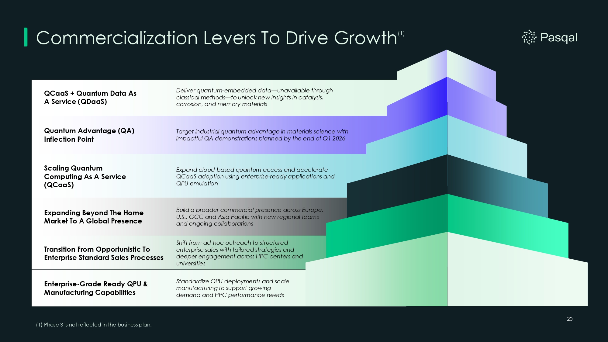 20 Commercialization Levers To Drive Growth (1) Expanding Beyond The Home Market To A Global Presence Enterprise - Grade Ready QPU & Manufacturing Capabilities Scaling Quantum Computing As A Service (QCaaS) Build a broader commercial presence across Europe, U.S., GCC and Asia Pacific with new regional teams and ongoing collaborations Expand cloud - based quantum access and accelerate QCaaS adoption using enterprise - ready applications and QPU emulation Standardize QPU deployments and scale manufacturing to support growing demand and HPC performance needs Shift from ad - hoc outreach to structured enterprise sales with tailored strategies and deeper engagement across HPC centers and universities Transition From Opportunistic To Enterprise Standard Sales Processes QCaaS + Quantum Data As A Service (QDaaS) Quantum Advantage (QA) Inflection Point Target industrial quantum advantage in materials science with impactful QA demonstrations planned by the end of Q1 2026 Deliver quantum - embedded data — unavailable through classical methods — to unlock new insights in catalysis, corrosion, and memory materials (1) Phase 3 is not reflected in the business plan.