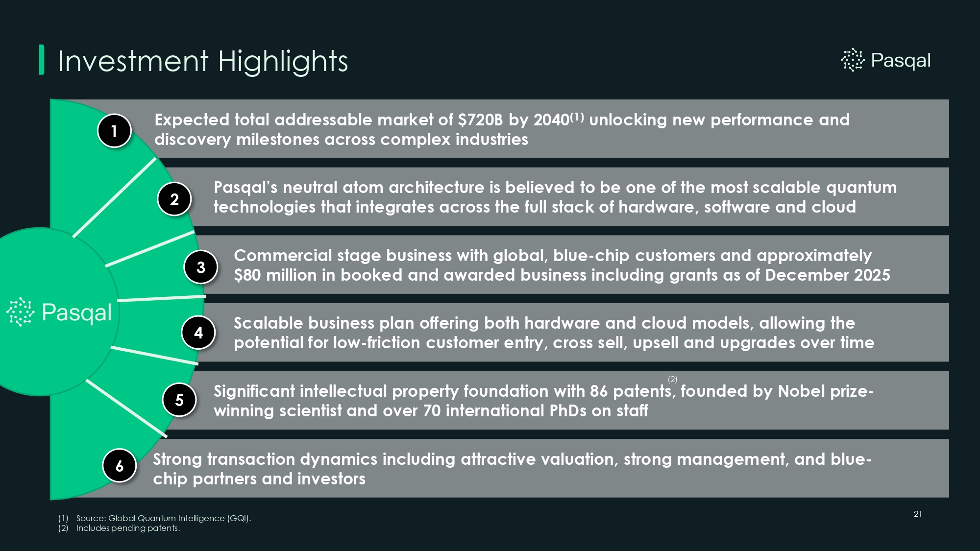 Investment Highlights Strong transaction dynamics including attractive valuation, strong management, and blue - chip partners and investors Significant intellectual property foundation with 86 patents, founded by Nobel prize - winning scientist and over 70 international PhDs on staff Commercial stage business with global, blue - chip customers and approximately $80 million in booked and awarded business including grants as of December 2025 Expected total addressable market of $720B by 2040 (1) unlocking new performance and discovery milestones across complex industries Pasqal’s neutral atom architecture is believed to be one of the most scalable quantum technologies that integrates across the full stack of hardware, software and cloud Scalable business plan offering both hardware and cloud models, allowing the potential for low - friction customer entry, cross sell, upsell and upgrades over time 1 2 3 4 5 6 21 (1) Source: Global Quantum Intelligence (GQI). (2) Includes pending patents. (2)