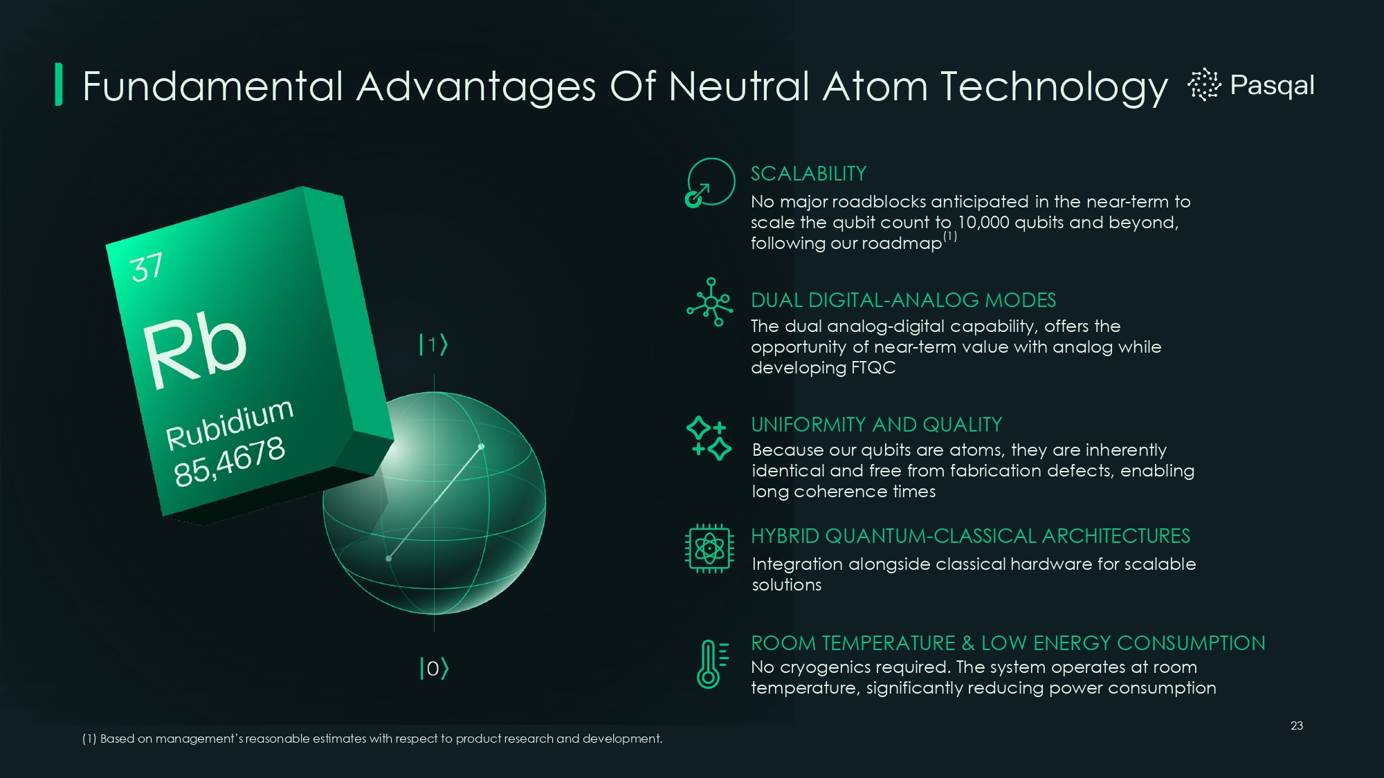 Fundamental Advantages Of Neutral Atom Technology SCALABILITY No major roadblocks anticipated in the near - term to scale the qubit count to 10,000 qubits and beyond, following our roadmap (1) DUAL DIGITAL - ANALOG MODES The dual analog - digital capability, offers the opportunity of near - term value with analog while developing FTQC UNIFORMITY AND QUALITY Because our qubits are atoms, they are inherently identical and free from fabrication defects, enabling long coherence times HYBRID QUANTUM - CLASSICAL ARCHITECTURES Integration alongside classical hardware for scalable solutions ROOM TEMPERATURE & LOW ENERGY CONSUMPTION No cryogenics required. The system operates at room temperature, significantly reducing power consumption 23 (1) Based on management’s reasonable estimates with respect to product research and development.