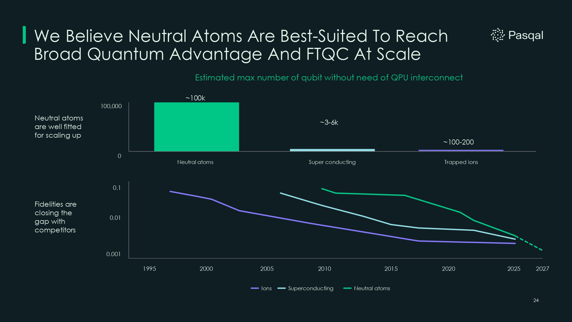 0 100,000 Neutral atoms ~3 - 6k Super conducting ~100 - 200 Trapped ions Estimated max number of qubit without need of QPU interconnect ~100k 1995 2000 2005 2010 2015 2020 2025 0.001 0.01 0.1 Ions Superconducting Neutral atoms Neutral atoms are well fitted for scaling up Fidelities are closing the gap with competitors 24 We Believe Neutral Atoms Are Best - Suited To Reach Broad Quantum Advantage And FTQC At Scale 2027