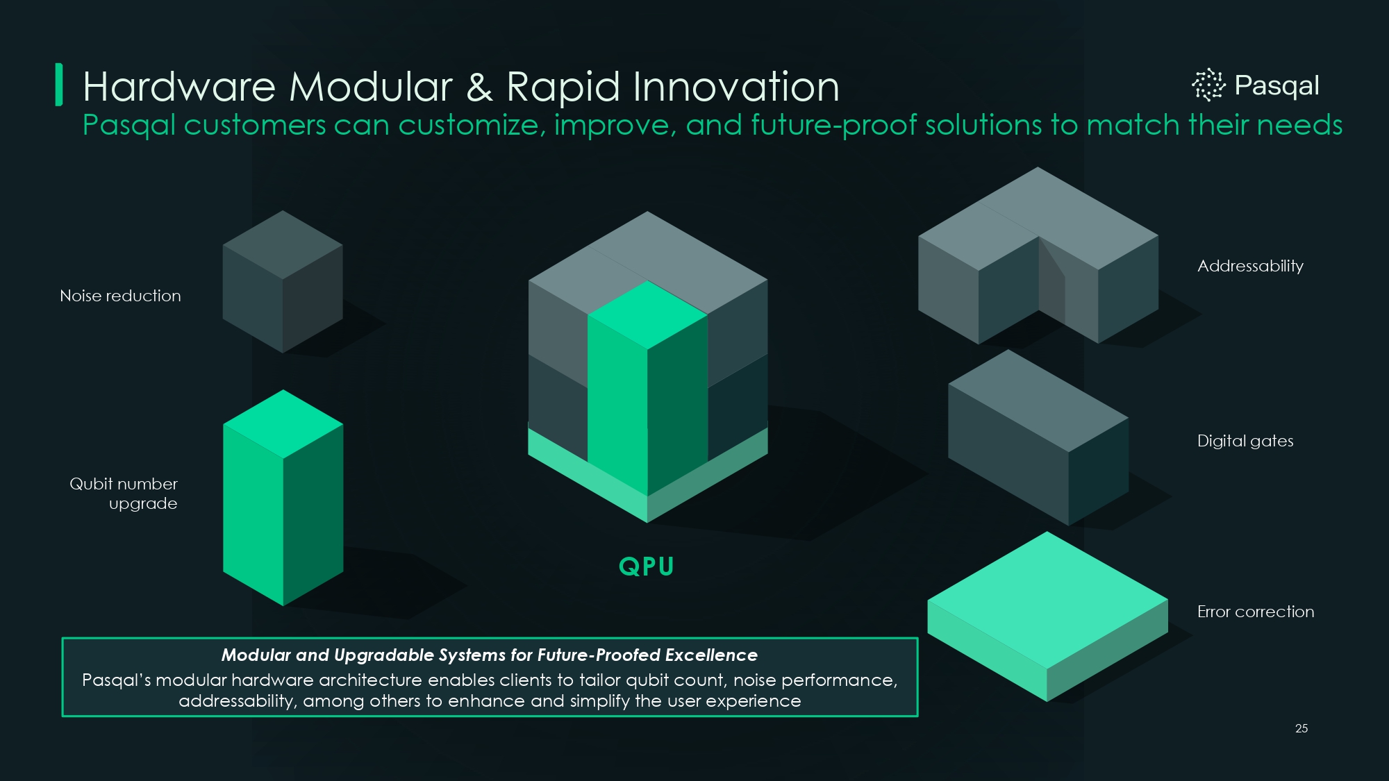 Hardware Modular & Rapid Innovation Pasqal customers can customize, improve, and future - proof solutions to match their needs Qubit number upgrade Noise reduction Digital gates Error correction Addressability QPU 25 Modular and Upgradable Systems for Future - Proofed Excellence Pasqal’s modular hardware architecture enables clients to tailor qubit count, noise performance, addressability, among others to enhance and simplify the user experience