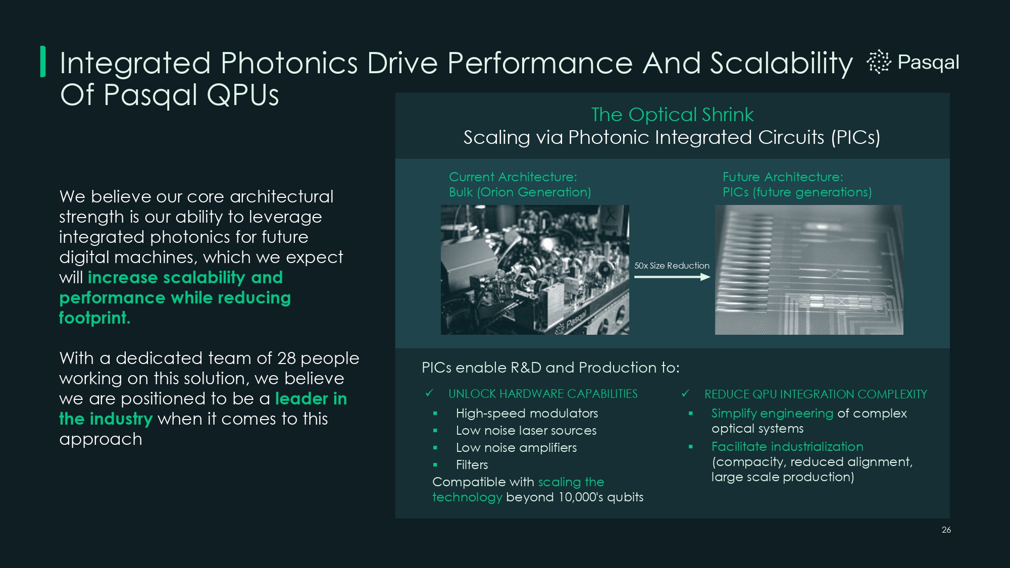 Integrated Photonics Drive Performance And Scalability Of Pasqal QPUs We believe our core architectural strength is our ability to leverage integrated photonics for future digital machines, which we expect will increase scalability and performance while reducing footprint. With a dedicated team of 28 people working on this solution, we believe we are positioned to be a leader in the industry when it comes to this approach x UNLOCK HARDWARE CAPABILITIES ▪ High - speed modulators ▪ Low noise laser sources ▪ Low noise amplifiers ▪ Filters Compatible with scaling the technology beyond 10,000's qubits x REDUCE QPU INTEGRATION COMPLEXITY ▪ Simplify engineering of complex optical systems ▪ Facilitate industrialization (compacity, reduced alignment, large scale production) Future Architecture: PICs (future generations) Current Architecture: Bulk (Orion Generation) The Optical Shrink Scaling via Photonic Integrated Circuits (PICs) PICs enable R&D and Production to: 26 50x Size Reduction