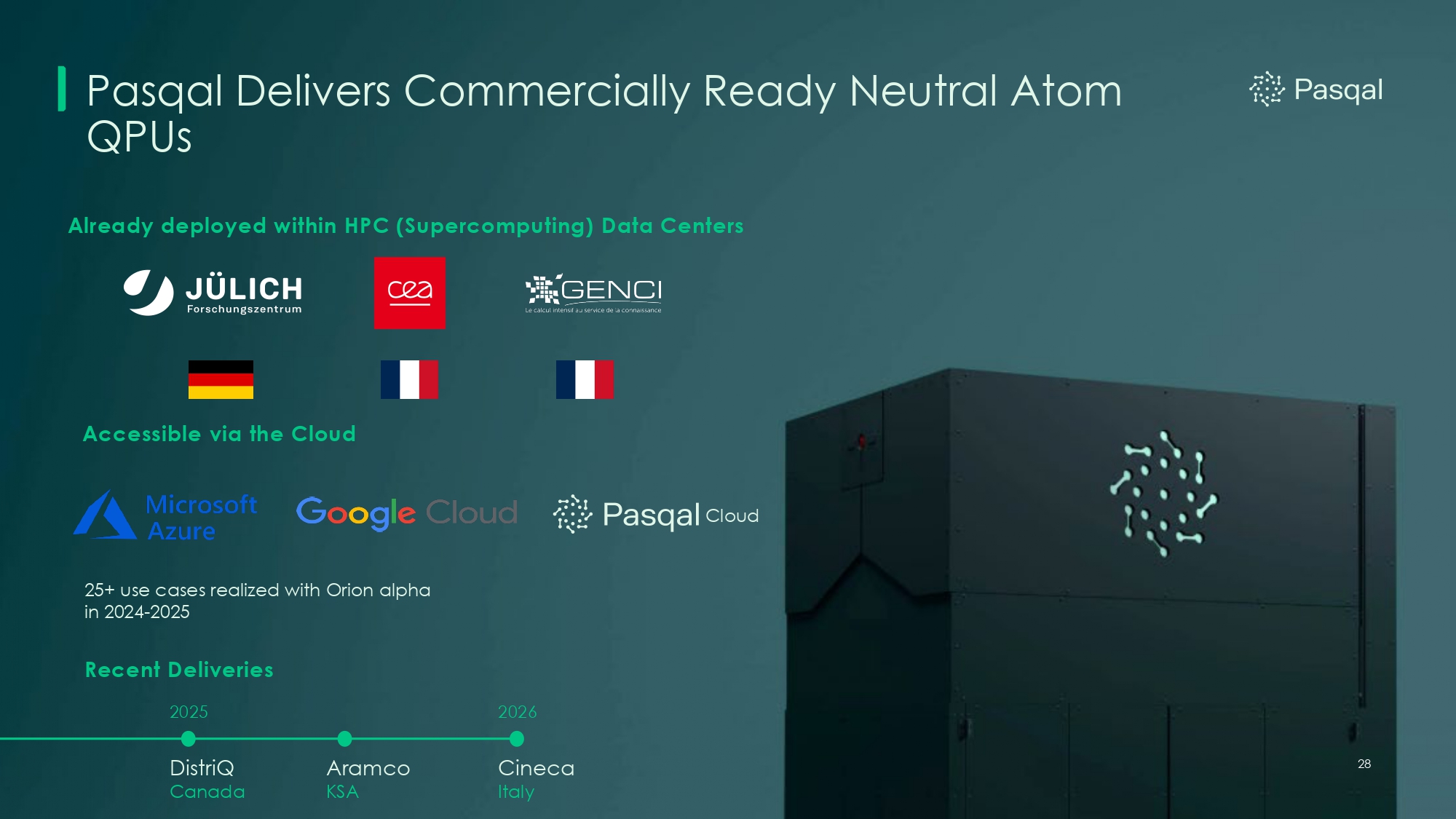 Pasqal Delivers Commercially Ready Neutral Atom QPUs Already deployed within HPC (Supercomputing) Data Centers 25+ use cases realized with Orion alpha in 2024 - 2025 Accessible via the Cloud Cloud DistriQ Canada Aramco KSA 2026 Cineca Italy Recent Deliveries 2025 28