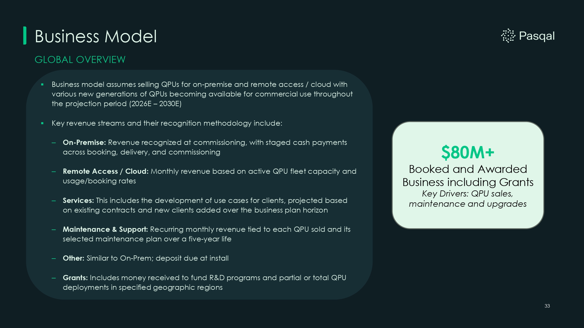 – On - Premise: Revenue recognized at commissioning, with staged cash payments across booking, delivery, and commissioning – Remote Access / Cloud: Monthly revenue based on active QPU fleet capacity and usage/booking rates – Services: This includes the development of use cases for clients, projected based on existing contracts and new clients added over the business plan horizon – Maintenance & Support: Recurring monthly revenue tied to each QPU sold and its selected maintenance plan over a five - year life – Other: Similar to On - Prem; deposit due at install – Grants: Includes money received to fund R&D programs and partial or total QPU deployments in specified geographic regions Business Model 33 GLOBAL OVERVIEW ▪ Business model assumes selling QPUs for on - premise and remote access / cloud with various new generations of QPUs becoming available for commercial use throughout the projection period (2026E – 2030E) ▪ Key revenue streams and their recognition methodology include: $80M+ Booked and Awarded Business including Grants Key Drivers: QPU sales, maintenance and upgrades