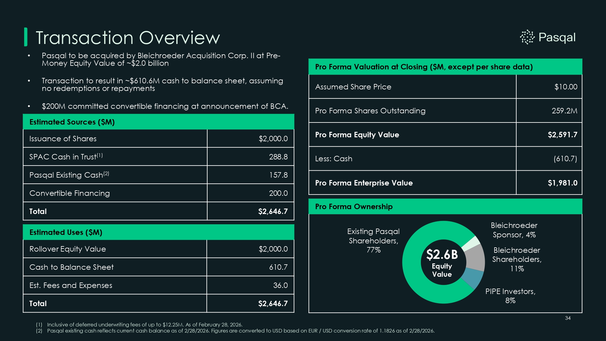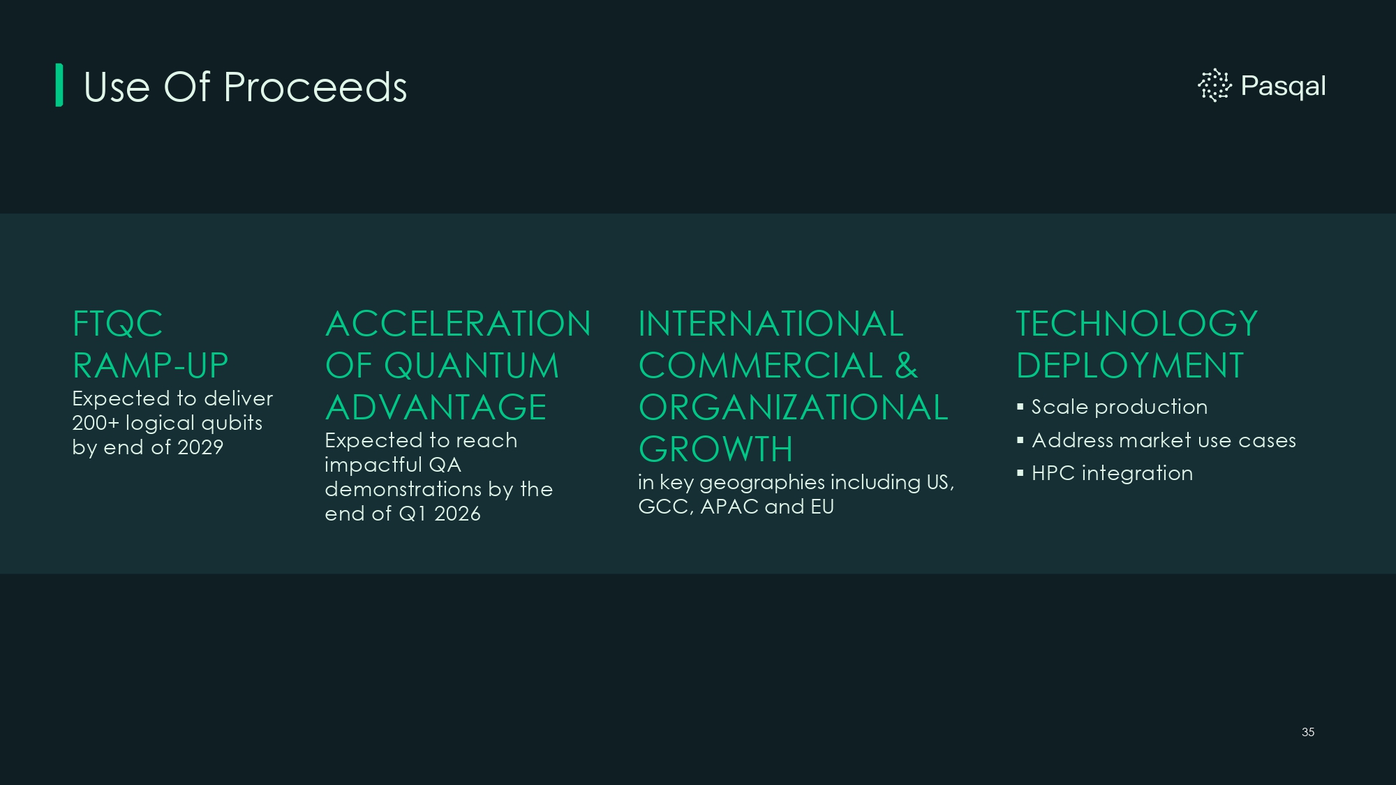 34 Transaction Overview Estimated Uses ($M) $2,000.0 Rollover Equity Value 610.7 Cash to Balance Sheet 36.0 Est. Fees and Expenses $2,646.7 Total • Pasqal to be acquired by Bleichroeder Acquisition Corp. II at Pre - Money Equity Value of ~$2.0 billion • Transaction to result in ~$610.6M cash to balance sheet, assuming no redemptions or repayments • $200M committed convertible financing at announcement of BCA. Estimated Sources ($M) $2,000.0 Issuance of Shares 288.8 SPAC Cash in Trust (1) 157.8 Pasqal Existing Cash (2) 200.0 Convertible Financing $2,646.7 Total Pro Forma Valuation at Closing ($M, except per share data) $10.00 Assumed Share Price 259.2M Pro Forma Shares Outstanding $2,591.7 Pro Forma Equity Value (610.7) Less: Cash $1,981.0 Pro Forma Enterprise Value Pro Forma Ownership Existing Pasqal Shareholders, 77% Bleichroeder Sponsor, 4% Bleichroeder Shareholders, 11% PIPE Investors, 8% $2.6B Equity Value (1) Inclusive of deferred underwriting fees of up to $12.25M. As of February 28, 2026. (2) Pasqal existing cash reflects current cash balance as of 2/28/2026. Figures are converted to USD based on EUR / USD conversion rate of 1.1826 as of 2/28/2026.