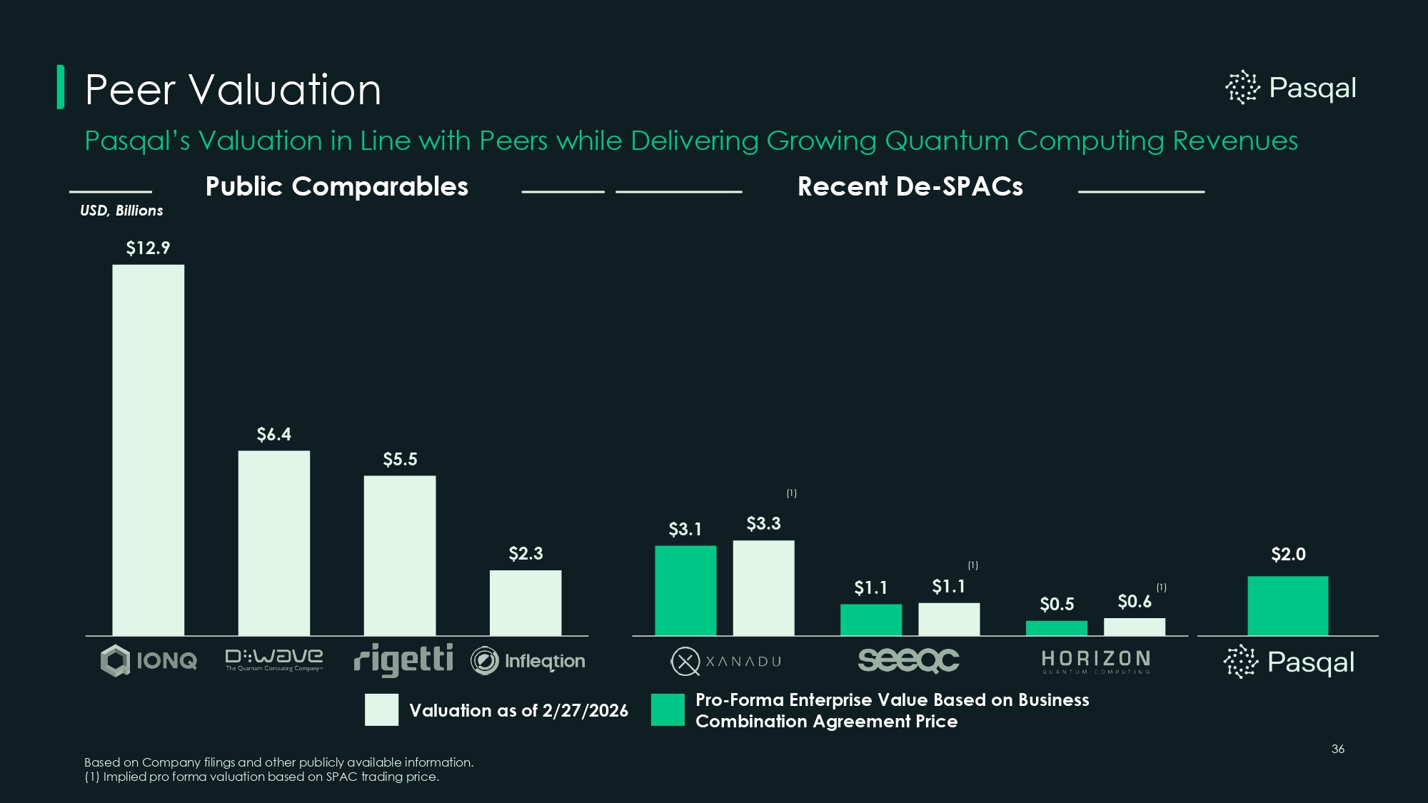 Peer Valuation Valuation as of 2/27/2026 Pro - Forma Enterprise Value Based on Business Combination Agreement Price Based on Company filings and other publicly available information. (1) Implied pro forma valuation based on SPAC trading price. (1) (1) Pasqal’s Valuation in Line with Peers while Delivering Growing Quantum Computing Revenues Public Comparables Recent De - SPACs $2.0 36 $3.1 $1.1 $0.5 $3.3 $1.1 (1) $0.6 USD, Billions $12.9 $6.4 $5.5 $2.3
