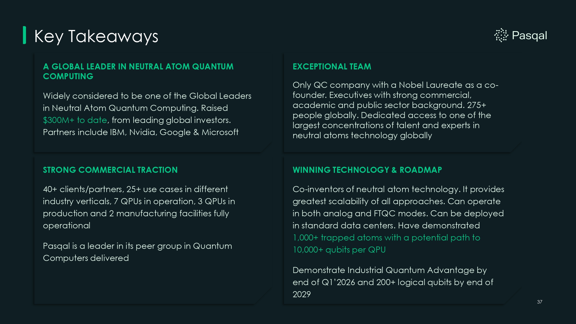 A GLOBAL LEADER IN NEUTRAL ATOM QUANTUM COMPUTING Widely considered to be one of the Global Leaders in Neutral Atom Quantum Computing. Raised $300M+ to date , from leading global investors. Partners include IBM, Nvidia, Google & Microsoft STRONG COMMERCIAL TRACTION 40+ clients/partners, 25+ use cases in different industry verticals, 7 QPUs in operation, 3 QPUs in production and 2 manufacturing facilities fully operational Pasqal is a leader in its peer group in Quantum Computers delivered Key Takeaways EXCEPTIONAL TEAM Only QC company with a Nobel Laureate as a co - founder. Executives with strong commercial, academic and public sector background. 275+ people globally. Dedicated access to one of the largest concentrations of talent and experts in neutral atoms technology globally WINNING TECHNOLOGY & ROADMAP Co - inventors of neutral atom technology. It provides greatest scalability of all approaches. Can operate in both analog and FTQC modes. Can be deployed in standard data centers. Have demonstrated 1,000+ trapped atoms with a potential path to 10,000+ qubits per QPU Demonstrate Industrial Quantum Advantage by end of Q1’2026 and 200+ logical qubits by end of 2029 37