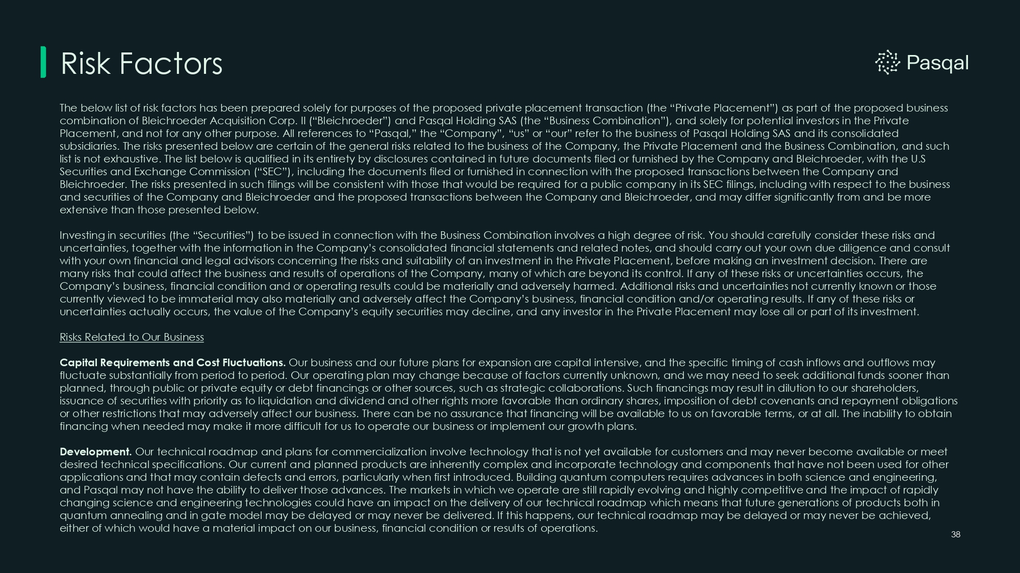 Risk Factors 38 The below list of risk factors has been prepared solely for purposes of the proposed private placement transaction (the “Private Placement”) as part of the proposed business combination of Bleichroeder Acquisition Corp. II (“Bleichroeder”) and Pasqal Holding SAS (the “Business Combination”), and solely for potential investors in the Private Placement, and not for any other purpose. All references to “Pasqal,” the “Company”, “us” or “our” refer to the business of Pasqal Holding SAS and its consolidated subsidiaries. The risks presented below are certain of the general risks related to the business of the Company, the Private Placement and the Business Combination, and such list is not exhaustive. The list below is qualified in its entirety by disclosures contained in future documents filed or furnished by the Company and Bleichroeder, with the U.S Securities and Exchange Commission (“SEC”), including the documents filed or furnished in connection with the proposed transactions between the Company and Bleichroeder. The risks presented in such filings will be consistent with those that would be required for a public company in its SEC filings, including with respect to the business and securities of the Company and Bleichroeder and the proposed transactions between the Company and Bleichroeder, and may differ significantly from and be more extensive than those presented below. Investing in securities (the “Securities”) to be issued in connection with the Business Combination involves a high degree of risk. You should carefully consider these risks and uncertainties, together with the information in the Company’s consolidated financial statements and related notes, and should carry out your own due diligence and consult with your own financial and legal advisors concerning the risks and suitability of an investment in the Private Placement, before making an investment decision. There are many risks that could affect the business and results of operations of the Company, many of which are beyond its control. If any of these risks or uncertainties occurs, the Company’s business, financial condition and or operating results could be materially and adversely harmed. Additional risks and uncertainties not currently known or those currently viewed to be immaterial may also materially and adversely affect the Company’s business, financial condition and/or operating results. If any of these risks or uncertainties actually occurs, the value of the Company’s equity securities may decline, and any investor in the Private Placement may lose all or part of its investment. Risks Related to Our Business Capital Requirements and Cost Fluctuations. Our business and our future plans for expansion are capital intensive, and the specific timing of cash inflows and outflows may fluctuate substantially from period to period. Our operating plan may change because of factors currently unknown, and we may need to seek additional funds sooner than planned, through public or private equity or debt financings or other sources, such as strategic collaborations. Such financings may result in dilution to our shareholders, issuance of securities with priority as to liquidation and dividend and other rights more favorable than ordinary shares, imposition of debt covenants and repayment obligations or other restrictions that may adversely affect our business. There can be no assurance that financing will be available to us on favorable terms, or at all. The inability to obtain financing when needed may make it more difficult for us to operate our business or implement our growth plans. Development. Our technical roadmap and plans for commercialization involve technology that is not yet available for customers and may never become available or meet desired technical specifications. Our current and planned products are inherently complex and incorporate technology and components that have not been used for other applications and that may contain defects and errors, particularly when first introduced. Building quantum computers requires advances in both science and engineering, and Pasqal may not have the ability to deliver those advances. The markets in which we operate are still rapidly evolving and highly competitive and the impact of rapidly changing science and engineering technologies could have an impact on the delivery of our technical roadmap which means that future generations of products both in quantum annealing and in gate model may be delayed or may never be delivered. If this happens, our technical roadmap may be delayed or may never be achieved, either of which would have a material impact on our business, financial condition or results of operations.