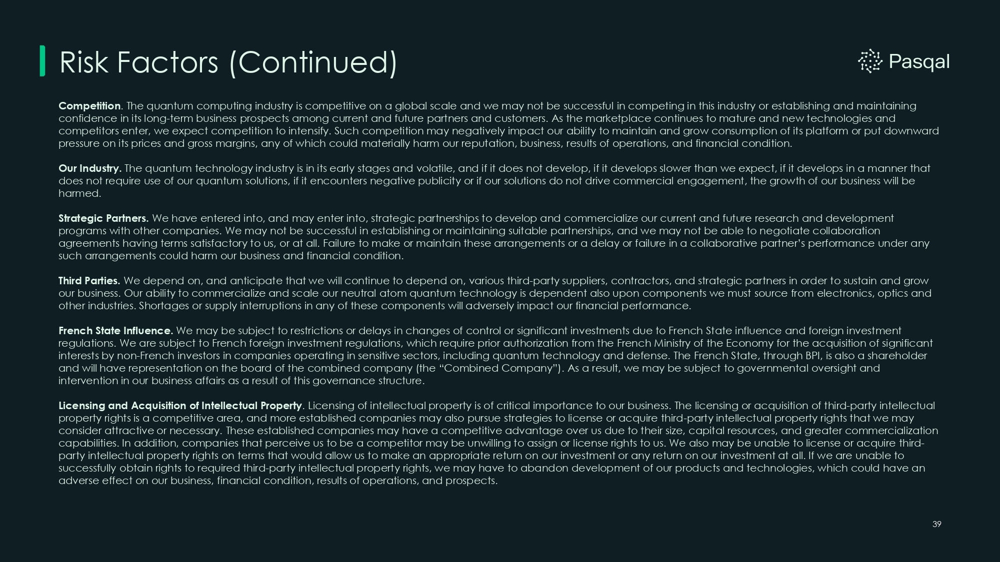Risk Factors (Continued) 39 Competition . The quantum computing industry is competitive on a global scale and we may not be successful in competing in this industry or establishing and maintaining confidence in its long - term business prospects among current and future partners and customers. As the marketplace continues to mature and new technologies and competitors enter, we expect competition to intensify. Such competition may negatively impact our ability to maintain and grow consumption of its platform or put downward pressure on its prices and gross margins, any of which could materially harm our reputation, business, results of operations, and financial condition. Our Industry. The quantum technology industry is in its early stages and volatile, and if it does not develop, if it develops slower than we expect, if it develops in a manner that does not require use of our quantum solutions, if it encounters negative publicity or if our solutions do not drive commercial engagement, the growth of our business will be harmed. Strategic Partners. We have entered into, and may enter into, strategic partnerships to develop and commercialize our current and future research and development programs with other companies. We may not be successful in establishing or maintaining suitable partnerships, and we may not be able to negotiate collaboration agreements having terms satisfactory to us, or at all. Failure to make or maintain these arrangements or a delay or failure in a collaborative partner’s performance under any such arrangements could harm our business and financial condition. Third Parties . We depend on, and anticipate that we will continue to depend on, various third - party suppliers, contractors, and strategic partners in order to sustain and grow our business . Our ability to commercialize and scale our neutral atom quantum technology is dependent also upon components we must source from electronics, optics and other industries . Shortages or supply interruptions in any of these components will adversely impact our financial performance . French State Influence. We may be subject to restrictions or delays in changes of control or significant investments due to French State influence and foreign investment regulations. We are subject to French foreign investment regulations, which require prior authorization from the French Ministry of the Economy for the acquisition of significant interests by non - French investors in companies operating in sensitive sectors, including quantum technology and defense. The French State, through BPI, is also a shareholder and will have representation on the board of the combined company (the “Combined Company”). As a result, we may be subject to governmental oversight and intervention in our business affairs as a result of this governance structure. Licensing and Acquisition of Intellectual Property . Licensing of intellectual property is of critical importance to our business. The licensing or acquisition of third - party intellectual property rights is a competitive area, and more established companies may also pursue strategies to license or acquire third - party intellectual property rights that we may consider attractive or necessary. These established companies may have a competitive advantage over us due to their size, capital resources, and greater commercialization capabilities. In addition, companies that perceive us to be a competitor may be unwilling to assign or license rights to us. We also may be unable to license or acquire third - party intellectual property rights on terms that would allow us to make an appropriate return on our investment or any return on our investment at all. If we are unable to successfully obtain rights to required third - party intellectual property rights, we may have to abandon development of our products and technologies, which could have an adverse effect on our business, financial condition, results of operations, and prospects.