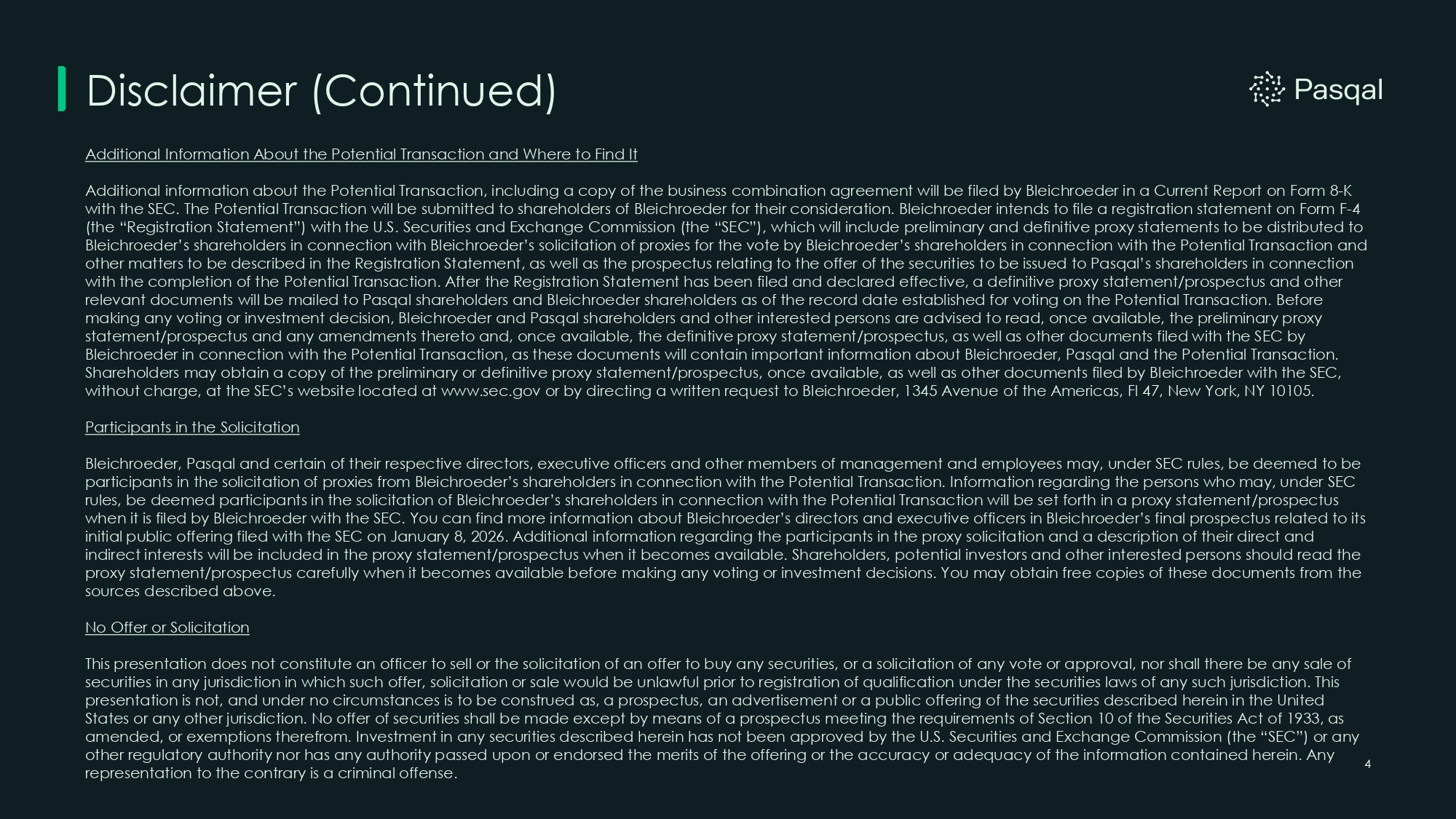 Disclaimer (Continued) 3 All statements other than statements of historical facts contained in this presentation are forward - looking statements. Forward - looking statements may generally be identified by the use of words such as “believe,” “may,” “will,” “estimate,” “continue,” “anticipate,” “intend,” “expect,” “should,” “would,” “plan,” “project,” “forecast,” “predict,” “potential,” “seem,” “seek,” “future,” “outlook,” “target” or other similar expressions that predict or indicate future events or trends or that are not statements of historical matters. Forward - looking statements are based on the current expectations of Bleichroeder and/or Pasqal’s management and are subject to various known and unknown risks and uncertainties that could cause actual results to differ materially and adversely from those expressed or implied by such forward - looking statements. These statements include, among other things, statements regarding future events, the Potential Transaction between Bleichroeder and Pasqal, the estimated or anticipated future results and benefits of the combined company following the Potential Transaction, including the likelihood and ability of the parties to successfully consummate the Potential Transaction, future opportunities for the combined company, the committed PIPE financing, Pasqal’s use of proceeds from its capital raising transactions and expectations with respect to future raises; Pasqal’s expectations concerning its production capacity, workforce, employees and investments; Pasqal’s expectations relating to the Potential Transaction, its plan to pursue a dual listing and timing thereof; Pasqal’s research and development expectations; Pasqal’s expectations relating to its governance and maintenance of status as a French legal entity; Pasqal’s expectations concerning relationships with strategic partners, investors, and other third parties; and other statements that are not historical facts. Nothing in these materials is, or shall be relied on as, a promise or representation as to future performance. Any projections, forecasts and other estimates contained in these materials are for illustrative purposes only, based on various assumptions that may or may not accurately reflect future developments, and involve known and unknown risks and uncertainties that may cause actual results to differ materially from those reflected in these materials. Past performance is not indicative of future results and no representation or warranty, express or implied, is made as to the accuracy of any such projections, forecasts or other estimates. Changes in assumptions may have a material impact on the information included in these materials. Any forward - looking statements speak only as of the date they are made and each of Pasqal and Bleichroeder assumes no duty to and does not undertake to update forward - looking statements. These materials do not purport to set forth all of the terms and conditions of any Potential Transaction or to contain all of the information that a prospective investor may desire or require in its consideration of any Potential Transaction. The information presented in these materials is not guaranteed as to accuracy, does not purport to be complete and should not be used to form the basis of, be relied upon for, any investment decision. These materials shall be superseded in all respects by the disclosures, terms and conditions contained in the definitive disclosure or purchase documents, as applicable, and related information and documentation, if, as and when made, which may differ materially from the information presented in these materials. None of Pasqal, Bleichroeder or any of their respective Representatives makes any representation or warranty, express or implied, regarding the legal, tax or accounting impact of any prospective investor’s investment in any Potential Transaction or any other matter described herein. By accepting delivery of these materials, each Recipient will be deemed to acknowledge and agree to the matters described above. If you are not the intended recipient of this document, please delete and destroy all copies immediately. This presentation also contains estimates and other statistical data made by independent third parties and by Pasqal and Bleichroeder relating to market size and growth and other data about Pasqal’s industry. This data involves a number of assumptions and limitations, and each recipient is cautioned not to give undue weight to such estimates and other statistical data. The information contained in the third - party citations and websites referenced in this presentation is not incorporated by reference into this presentation. In addition, projections, assumptions and estimates of Pasqal’s future performance and the future performance of the markets in which Pasqal operates are necessarily subject to a high degree of uncertainty and risk. For a description of certain risks relating to Pasqal, including its business and operations, and to the Potential Transaction, please refer to “Risk Factors” at the end of this presentation.
