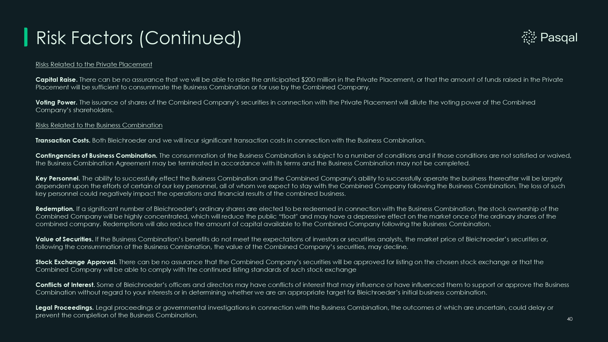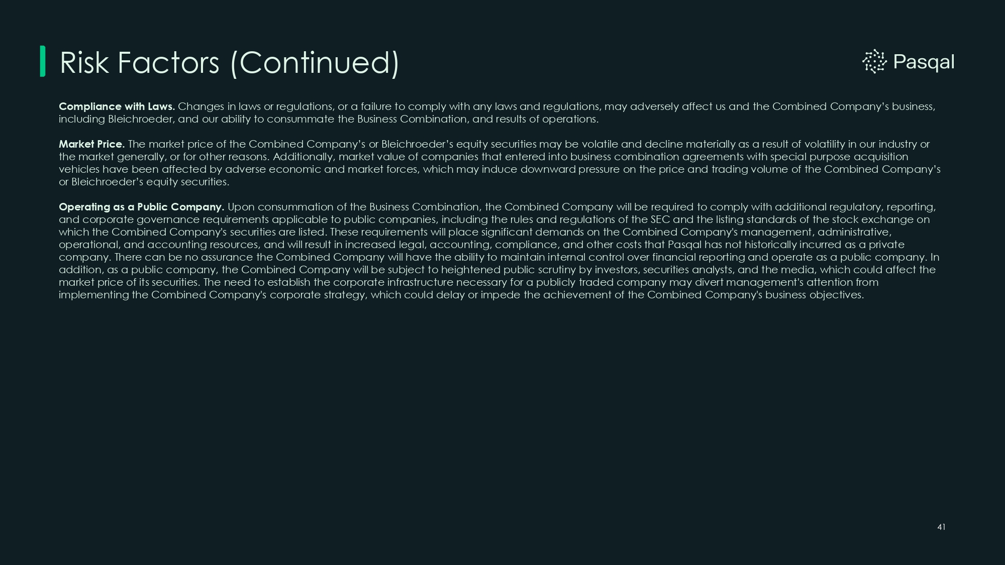 Risk Factors (Continued) 41 Compliance with Laws. Changes in laws or regulations, or a failure to comply with any laws and regulations, may adversely affect us and the Combined Company’s business, including Bleichroeder, and our ability to consummate the Business Combination, and results of operations. Market Price. The market price of the Combined Company’s or Bleichroeder’s equity securities may be volatile and decline materially as a result of volatility in our industry or the market generally, or for other reasons. Additionally, market value of companies that entered into business combination agreements with special purpose acquisition vehicles have been affected by adverse economic and market forces, which may induce downward pressure on the price and trading volume of the Combined Company’s or Bleichroeder’s equity securities. Operating as a Public Company. Upon consummation of the Business Combination, the Combined Company will be required to comply with additional regulatory, reporting, and corporate governance requirements applicable to public companies, including the rules and regulations of the SEC and the listing standards of the stock exchange on which the Combined Company's securities are listed. These requirements will place significant demands on the Combined Company's management, administrative, operational, and accounting resources, and will result in increased legal, accounting, compliance, and other costs that Pasqal has not historically incurred as a private company. There can be no assurance the Combined Company will have the ability to maintain internal control over financial reporting and operate as a public company. In addition, as a public company, the Combined Company will be subject to heightened public scrutiny by investors, securities analysts, and the media, which could affect the market price of its securities. The need to establish the corporate infrastructure necessary for a publicly traded company may divert management's attention from implementing the Combined Company's corporate strategy, which could delay or impede the achievement of the Combined Company's business objectives.