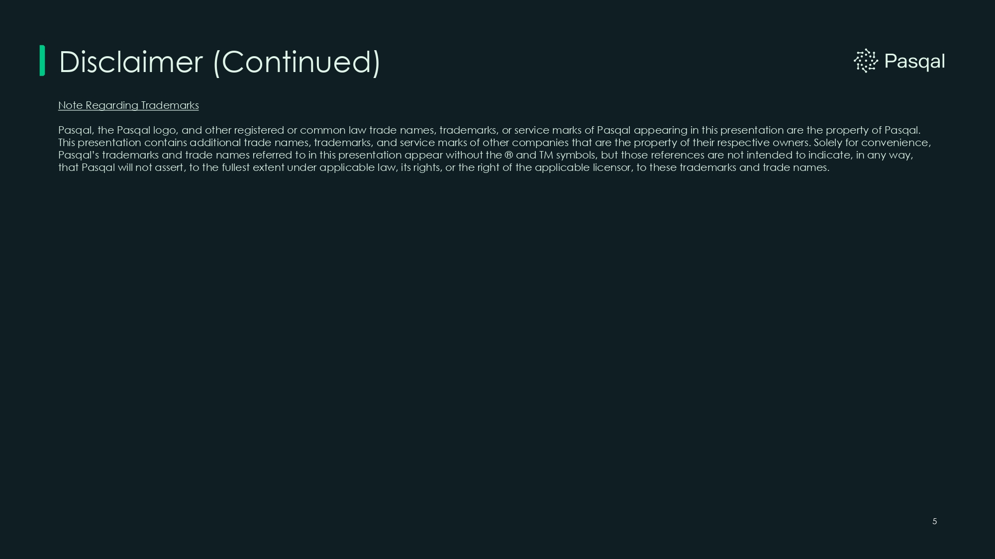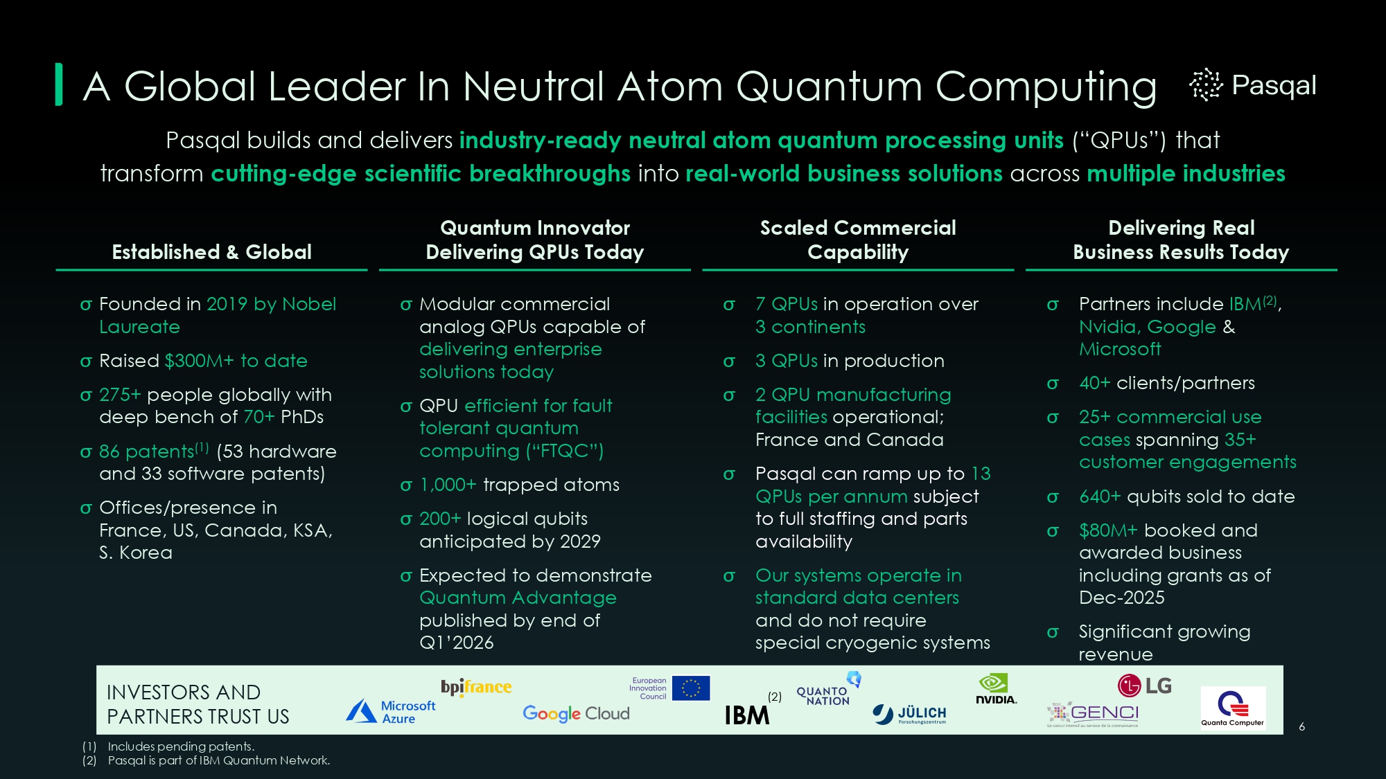 Disclaimer (Continued) 5 Note Regarding Trademarks Pasqal, the Pasqal logo, and other registered or common law trade names, trademarks, or service marks of Pasqal appearing in this presentation are the property of Pasqal. This presentation contains additional trade names, trademarks, and service marks of other companies that are the property of their respective owners. Solely for convenience, Pasqal’s trademarks and trade names referred to in this presentation appear without the ® and TM symbols, but those references are not intended to indicate, in any way, that Pasqal will not assert, to the fullest extent under applicable law, its rights, or the right of the applicable licensor, to these trademarks and trade names.