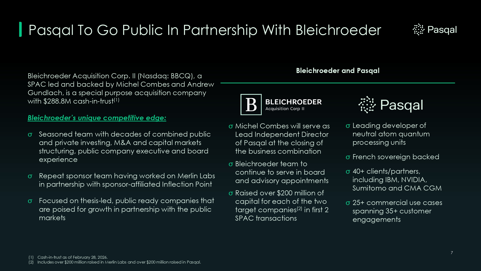 Pasqal To Go Public In Partnership With Bleichroeder 7 (1) Cash - in - trust as of February 28, 2026. (2) Includes over $200 million raised in Merlin Labs and over $200 million raised in Pasqal. Bleichroeder Acquisition Corp. II (Nasdaq: BBCQ), a SPAC led and backed by Michel Combes and Andrew Gundlach, is a special purpose acquisition company with $288.8M cash - in - trust (1) Bleichroeder’s unique competitive edge: Seasoned team with decades of combined public and private investing, M&A and capital markets structuring, public company executive and board experience Repeat sponsor team having worked on Merlin Labs in partnership with sponsor - affiliated Inflection Point Focused on thesis - led, public ready companies that are poised for growth in partnership with the public markets Bleichroeder and Pasqal Michel Combes will serve as Lead Independent Director of Pasqal at the closing of the business combination Bleichroeder team to continue to serve in board and advisory appointments Raised over $200 million of capital for each of the two target companies ( 2 ) in first 2 SPAC transactions Leading developer of neutral atom quantum processing units French sovereign backed 40+ clients/partners, including IBM, NVIDIA, Sumitomo and CMA CGM 25+ commercial use cases spanning 35+ customer engagements