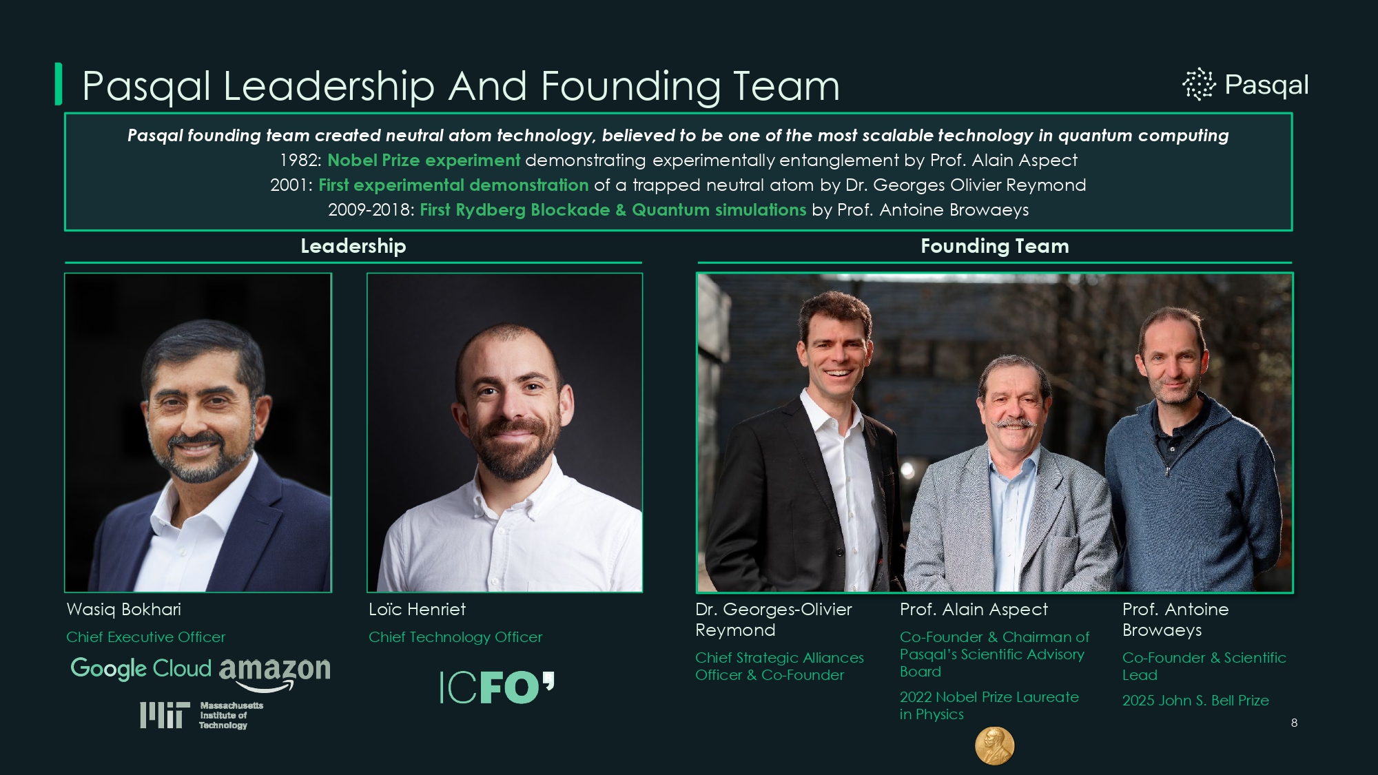 8 Pasqal Leadership And Founding Team Dr. Georges - Olivier Reymond Chief Strategic Alliances Officer & Co - Founder Prof. Antoine Browaeys Co - Founder & Scientific Lead 2025 John S. Bell Prize Prof. Alain Aspect Co - Founder & Chairman of Pasqal’s Scientific Advisory Board 2022 Nobel Prize Laureate in Physics Pasqal founding team created neutral atom technology, believed to be one of the most scalable technology in quantum computing 1982: Nobel Prize experiment demonstrating experimentally entanglement by Prof. Alain Aspect 2001: First experimental demonstration of a trapped neutral atom by Dr. Georges Olivier Reymond 2009 - 2018: First Rydberg Blockade & Quantum simulations by Prof. Antoine Browaeys Wasiq Bokhari Chief Executive Officer Loïc Henriet Chief Technology Officer Leadership Founding Team