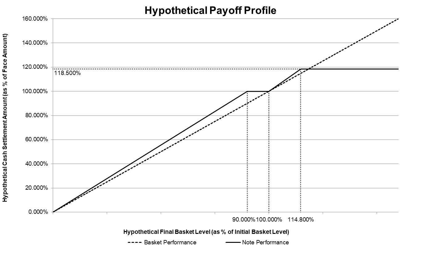 ●if the basket return is negative and is below -10.00% (the final basket level is less than the initial basket level by more than 10.00%), the sum of (i) $1,000 plus (ii) the product of (a) approximately 111.11% times (b) the sum of the basket return plus 10.00% times (c) $1,000.