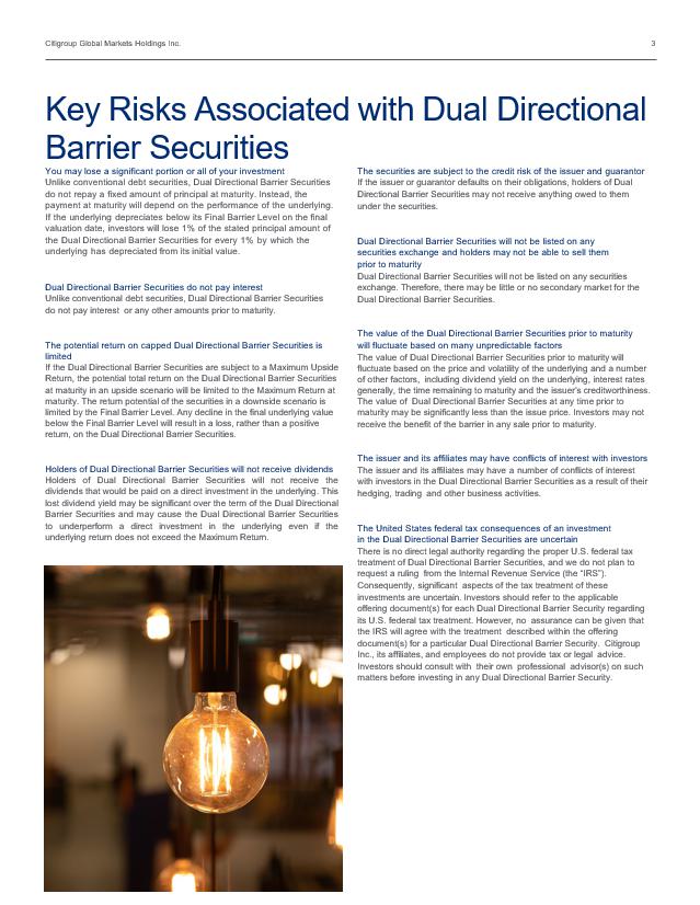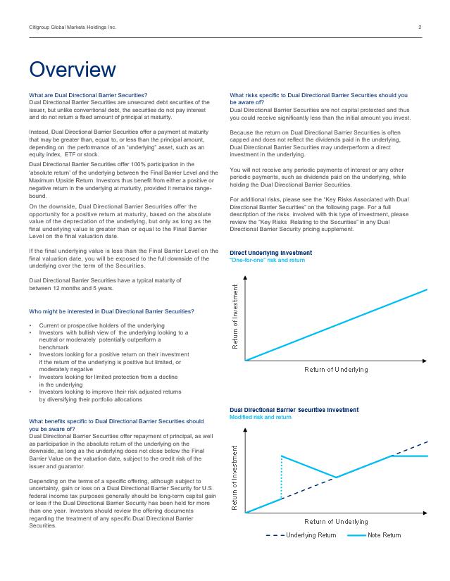 Citigroup Global Markets Holdings Inc. 2 What are Dual Directional Barrier Securities ? Dual Directional Barrier Securities are unsecured debt securities of the issuer, but unlike conventional debt, the securities do not pay interest and do not return a fixed amount of principal at maturity. Instead, Dual Directional Barrier Securities offer a payment at maturity that may be greater than, equal to, or less than the principal amount, depending on the performance of an “underlying” asset, such as an equity index, ETF or stock. On the downside, Dual Directional Barrier Securities offer the opportunity for a positive return at maturity, based on the absolute value of the depreciation of the underlying, but only as long as the final underlying value is greater than or equal to the Final Barrier Level on the final valuation date. If the final underlying value is less than the Final Barrier Level on the final valuation date, you will be exposed to the full downside of the underlying over the term of the Securities . Dual Directional Barrier Securities have a typical maturity of between 1 2 months and 5 years. Who might be interested in Dual Directional Barrier Securities ? • Current or prospective holders of the underlying • Investors with bullish view of the underlying looking to a neutral or moderately potentially outperform a benchmark • Investors looking for a positive return on their investment if the return of the underlying is positive but limited, or moderately negative • Investors looking for limited protection from a decline in the underlying • Investors looking to improve their risk adjusted returns by diversifying their portfolio allocations What benefits specific to Dual Directional Barrier Securities should you be aware of? Dual Directional Barrier Securities offer repayment of principal, as well as participation in the absolute return of the underlying on the downside, as long as the underlying does not close below the Final Barrier Value on the valuation date, subject to the credit risk of the issuer and guarantor. Depending on the terms of a specific offering, although subject to uncertainty , gain or loss on a Dual Directional Barrier Security for U.S. federal income tax purposes generally should be long - term capital gain or loss if the Dual Directional Barrier Security has been held for more than one year. Investors should review the offering documents regarding the treatment of any specific Dual Directional Barrier Securities. What risks specific to Dual Directional Barrier Securities should you be aware of? Dual Directional Barrier Securities are not capital protected and thus you could receive significantly less than the initial amount you invest. Because the return on Dual Directional Barrier Securities is often capped and does not reflect the dividends paid in the underlying, Dual Directional Barrier Securities may underperform a direct investment in the underlying. You will not receive any periodic payments of interest or any other periodic payments, such as dividends paid on the underlying, while holding the Dual Directional Barrier Securities . For additional risks, please see the “Key R isks A ssociated with Dual Directional Barrier Securities ” on the following page. For a full description of the risks involved with this type of investment, please review the “Key Risks Relating to the Securities” in any Dual Directional Barrier Security pricing supplement. Direct Underlying Investment “One - for - one” risk and return O verv i ew Dual Directional Barrier Securities Investment Modified risk and return Dual Directional Barrier Securities offer 100% participation in the ‘absolute return’ of the underlying between the Final Barrier Level and the Maximum Upside Return. Investors thus benefit from either a positive or negative return in the underlying at maturity, provided it remains range - bound. Return of Investment Return of Underlying Underlying Return Note Return Return of Investment Return of Underlying