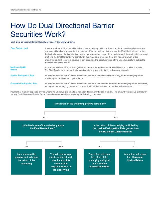 Citigroup Global Markets Holdings Inc. 3 You may lose a significant portion or all of your investment Unlike conventional debt securities, Dual Directional Barrier Securities do not repay a fixed amount of principal at maturity. Instead, the payment at maturity will depend on the performance of the underlying. If the underlying depreciates below its Final Barrier Level on the final valuation date, investors will lose 1% of the stated principal amount of the Dual Directional Barrier Securities for every 1% by which the underlying has depreciated from its initial value. Dual Directional Barrier Securities do not pay interest Unlike conventional debt securities, Dual Directional Barrier Securities do not pay interest or any other amounts prior to maturity. The potential return on capped Dual Directional Barrier Securities is limited If the Dual Directional Barrier Securities are subject to a M aximum Upside Return, the potential total return on the Dual Directional Barrier Securities at maturity in an upside scenario will be limited to the Maximum Return at maturity. The return potential of the securities in a downside scenario is limited by the Final Barrier Level. Any decline in the final underlying value below the Final Barrier Level will result in a loss, rather than a positive return, on the Dual Directional Barrier Securities. Holders of Dual Directional Barrier Securities will not receive dividends Holders of Dual Directional Barrier Securities will not receive the dividends that would be paid on a direct investment in the underlying . This lost dividend yield may be significant over the term of the Dual Directional Barrier Securities and may cause the Dual Directional Barrier Securities to underperform a direct investment in the underlying even if the underlying return does not exceed the M aximum R eturn . The securities are subject to the credit risk of the issuer and guarantor If the issuer or guarantor defaults on their obligations, holders of Dual Directional Barrier Securities may not receive anything owed to them under the securities. Dual Directional Barrier Securities will not be listed on any securities exchange and holders may not be able to sell them prior to maturity Dual Directional Barrier Securities will not be listed on any securities exchange. Therefore, there may be little or no secondary market for the Dual Directional Barrier Securities . The value of the Dual Directional Barrier Securities prior to maturity will fluctuate based on many unpredictable factors The value of Dual Directional Barrier Securities prior to maturity will fluctuate based on the price and volatility of the underlying and a numbe r of other factors, including dividend yield on the underlying, interest rates generally, the time remaining to maturity and the issuer’s creditworthiness . The value of Dual Directional Barrier Securities at any time prior to maturity may be significantly less than the issue price. Investors may not receive the benefit of the barrier in any sale prior to maturity. The issuer and its affiliates may have conflicts of interest with investors The issuer and its affiliates may have a number of conflicts of interest with investors in the Dual Directional Barrier Securities as a result of their hedging, trading and other business activities. The United States federal tax consequences of an investment in the Dual Directional Barrier Securities are uncertain There is no direct legal authority regarding the proper U.S. federal tax treatment of Dual Directional Barrier Securities , and we do not plan to request a ruling from the Internal Revenue Service (the “IRS”). Consequently, significant aspects of the tax treatment of these investments are uncertain. Investors should refer to the applicable offering document(s) for each Dual Directional Barrier Security regarding its U.S. federal tax treatment. However, no assurance can be given that the IRS will agree with the treatment described within the offering document(s) for a particular Dual Directional Barrier Security . Citigroup Inc., its affiliates, and employees do not provide tax or legal advice. Investors should consult with their own professional advisor(s) on such matters before investing in any Dual Directional Barrier Security . Key Risks Associated with Dual Directional Barrier Securities