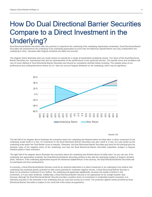 Citigroup Global Markets Holdings Inc. 5 Dual Directional Barrier Securities offer the potential to outperform the underlying if the underlying depreciate s moderately . Dual Directional Barrier Securities will underperform the underlying if the underlying appreciates by more than the Maximum Upside Return and may underperform th e underlying in other scenarios after forgone dividends are taken into account. The diagram below illustrates what you would receive at maturity for a range of hypothetical underlying returns. The terms of the Dual Directional Barrier Securities are hypothetical only and not representative of the performance of any particular security. The specific terms and conditions will vary for each offering of Dual Directional Barrier Securities and should be considered carefully before investing. The shaded areas o f out - performance and underperformance below do not take into account forgone dividends on the underlying, which may be significant. How Do Dual Directional Barrier Securities Compare to a Direct Investment in the Underlying? The left half of the diagram above illustrates the scenarios where the underlying has finished below its initial value . A direct investment in the underlying would result in a loss . An investment in the Dual Directional Barrier Securities may also result in a loss, but only insofar as the underlying ends below the Final Barrier Level at maturity . Otherwise, the Dual Directional Barrier Securities pay back the full principal plus the absolute value of the negative return of the underlying , and thus the Dual Directional Barrier Securities outperform (subject to forgone dividend yield) in these scenarios . The right half of the diagram above illustrates the scenarios where the underlying has finished above its initial value . As you can see, if the underlying has appreciated modestly, the Dual Directional Barrier Securities perform in line with the underlying (subject to forgone dividend yield) . However, if the underlying appreciates beyond the M aximum Upside R eturn of the security, the Dual Directional Barrier Securities will not participate and thus underperform. In summary, a Dual Directional Barrier Security could be an attractive alternative to a direct investment in an underlying if you believe that underlying has moderate growth potential but also some potential for moderate negative returns. A Dual Directional Barrier Security is likely not an attractive investment if you believe the underlying will appreciate significantly, because the upside is limited in this investment, or if you seek dividends. Additionally, a Dual Directional Barrier Security is not appropriate for an outright bearish view, because although the Dual Directional Barrier Security provides a positive return on investment in moderately bearish scenarios, it is ultimately exposed to the downside in the underlying and you may lose money as a result. The protection against losses provided by Dual Directional Barrier Securities is subject to the credit risk of the issuer and guarantor . Source: Citi -60% -40% -20% 0% 20% 40% 60% 50% 45% 40% 35% 30% 25% 20% 15% 10% 5% 0% -5% -10% -15% -20% -25% -30% -35% -40% -45% -50% Underlying Return Note Return
