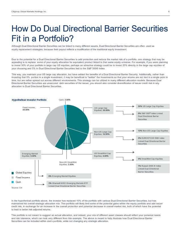 Citigroup Global Markets Holdings Inc. 6 Although Dual Directional Barrier Securities can be linked to many different assets, Dual Directional Barrier Securities are often used as equity replacement strategies, because their payout reflects a modification of the traditional equity investment. Due to the potential for a Dual Directional Barrier Securities to add protection and reduce the market risk of a portfolio, one strategy that may be appealing is to replace some of your equity allocation for equivalent product linked to that same equity universe. For example, if you were planning to invest 30% of your portfolio in large cap US equities, perhaps an attractive strategy could be to invest 25% directly in the large cap equities of your choosing and 5% in Dual Directional Barrier Securities tied to the S&P 500® Index. This way, you maintain your US large cap allocation, but have added the benefits of a Dual Directional Barrier Security . Additionally, rather than investing that 5% portion in a single investment, it may be beneficial to “ladder” the investments so that your returns are not tied to a single point in time, but are rather spread out across different environments. This strategy can be utilized in many different allocation models. Because Dual Directional Barrier Securities are unsecured debt securities of the issuer, you should also consider diversification of issuer credit risk in any allocation to Dual Directional Barrier Securities . How Do Dual Directional Barrier Securities Fit in a Portfolio? Source: Citi In the hypothetical portfolio above, the investor has replaced 10% of his portfolio with various Dual Directional Barrier Securities , but has maintained his overall strategic allocation mix. This portfolio will likely limit some of the potential gains within the equity portfolio and add issuer credit risk, in exchange for an increase in the overall protection and potential decrease in overall market risk, both of which have the potential to lead to better risk adjusted returns. This portfolio is not meant to suggest an actual allocation, and indeed, your mix of different asset classes should reflect your personal needs and risk tolerance, which can look very different from this example. The above is meant to help illustrate how Dual Directional Barrier Securities can be included within one’s portfolio, while not changing any strategic allocation. US Large Cap E qu i t i es ; 30.00% Non - US Large Cap Equities; 15.00% US Small/Mid Cap Equities ; 4.00% N on - US S m a ll / M id Equities; 2.00% E m erg i n g M ar k et Equities; 8.00% Fixed Income; 39.00% Cash; 2.00% 25% US Large Cap Equities 13% Non - US Large Cap Equities 3% Small/Mid Cap Equities 6% Emerging Market Equities Hypothetical Investor Portfolio G lo b a l E q u iti es F i x e d I n co m e C a sh 5% S&P 500 ® Index Linked Dual Directional Barrier Securities 2% EUROSTOXX 50® Index Linked Dual Directional Barrier Securities 1% Russell 2000 ® Index Linked Dual Directional Barrier Securities 2% iShares® MSCI Emerging Markets ETF Linked Dual Directional Barrier Securities