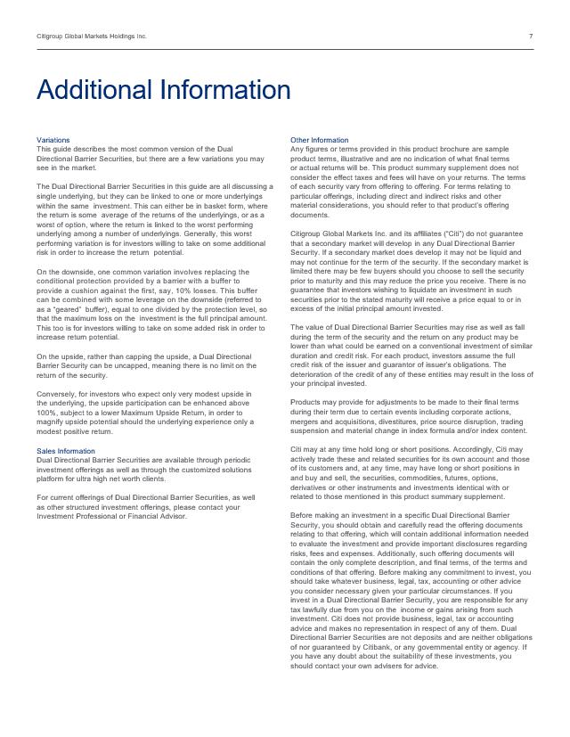 Citigroup Global Markets Holdings Inc. 7 Variations This guide describes the most common version of the Dual Directional Barrier Securities , but there are a few variations you may see in the market. The Dual Directional Barrier Securities in this guide are all discussing a single underlying , but they can be linked to one or more underlyings within the same investment. This can either be in basket form, where the return is some average of the returns of the underlyings, or as a worst of option, where the return is linked to the worst performing underlying among a number of underlyings . Generally , this worst performing variation is for investors willing to take on some additional risk in order to increase the return potential. On the downside, one common variation involves replacing the conditional protection provided by a barrier with a buffer to provide a cushion against the first, say, 10% losses. This buffer can be combined with some leverage on the downside (referred to as a “geared” buffer) , equal to one divided by the protection level, so that the maximum loss on the investment is the full principal amount. This too is for investors willing to take on some added risk in order to increase return potential. On the upside, rather than capping the upside, a Dual Directional Barrier Security can be uncapped , meaning there is no limit on the return of the security. Conversely, for investors who expect only very modest upside in the underlying, the upside participation can be enhanced above 100%, subject to a lower Maximum Upside Return, in order to magnify upside potential should the underlying experience only a modest positive return. S a l e s I n f or m a ti on Dual Directional Barrier Securities are available through periodic investment offerings as well as through the customized solutions platform for ultra high net worth clients. For current offerings of Dual Directional Barrier Securities , as well as other structured investment offerings, please contact your Investment Professional or Financial Advisor. Other Information Any figures or terms provided in this product brochure are sample product terms, illustrative and are no indication of what final terms or actual returns will be. This product summary supplement does not consider the effect taxes and fees will have on your returns. The terms of each security vary from offering to offering. For terms relating to particular offerings, including direct and indirect risks and other material considerations, you should refer to that product’s offering documents. Citigroup Global Markets Inc. and its affiliates (“Citi”) do not guarantee that a secondary market will develop in any Dual Directional Barrier Security. If a second ary market does develop it may not be liquid and may not continue for the term of the security. If the secondary market is limited there may be few buyers should you choose to sell the security prior to maturity and this may reduce the price you receive. There is no guarantee that investors wishing to liquidate an investment in such securities prior to the stated maturity will receive a price equal to or in excess of the initial principal amount invested. The value of Dual Directional Barrier Securities may rise as well as fall during the term of the security and the return on any product may be lower than what could be earned on a conventional investment of similar duration and credit risk. For each product, investors assume the full credit risk of the issuer and guarantor of issuer’s obligations. The deterioration of the credit of any of these entities may result in the loss of your principal invested. Products may provide for adjustments to be made to their final terms during their term due to certain events including corporate actions, mergers and acquisitions, divestitures, price source disruption, trading suspension and material change in index formula and/or index content. Citi may at any time hold long or short positions. Accordingly, Citi may actively trade these and related securities for its own account and those of its customers and, at any time, may have long or short positions in and buy and sell, the securities, commodities, futures, options, derivatives or other instruments and investments identical with or related to those mentioned in this product summary supplement. Before making an investment in a specific Dual Directional Barrier Security , you should obtain and carefully read the offering documents relating to that offering, which will contain additional information needed to evaluate the investment and provide important disclosures regarding risks, fees and expenses. Additionally, such offering documents will contain the only complete description, and final terms, of the terms and conditions of that offering. Before making any commitment to invest, you should take whatever business, legal, tax, accounting or other advice you consider necessary given your particular circumstances. If you invest in a Dual Directional Barrier Security , you are responsible for any tax lawfully due from you on the income or gains arising from such investment. Citi does not provide business, legal, tax or accounting advice and makes no representation in respect of any of them. Dual Directional Barrier Securities are not deposits and are neither obligations of nor guaranteed by Citibank, or any governmental entity or agency. If you have any doubt about the suitability of these investments, you should contact your own advisers for advice. Additional Information