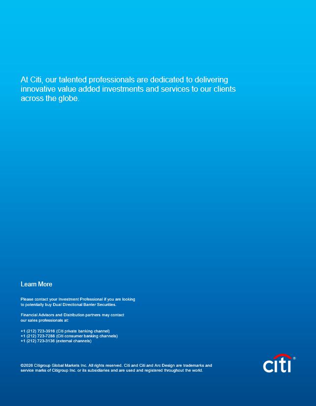 ©202 6 Citigroup Global Markets Inc. All rights reserved. Citi and Citi and Arc Design are trademarks and service marks of Citigroup Inc. or its subsidiaries and are used and registered throughout the world. Lea r n M o r e Please contact your Investment Professional if you are looking to potentially buy Dual Directional Barrier Securities . Financial Advisors and Distribution partners may contact our sales professionals at: +1 (212) 723 - 3916 (Citi private banking channel) +1 (212) 723 - 7288 (Citi consumer banking channels) +1 (212) 723 - 3136 (external channels) At Citi, our talented professionals are dedicated to delivering innovative value added investments and services to our clients across the globe.