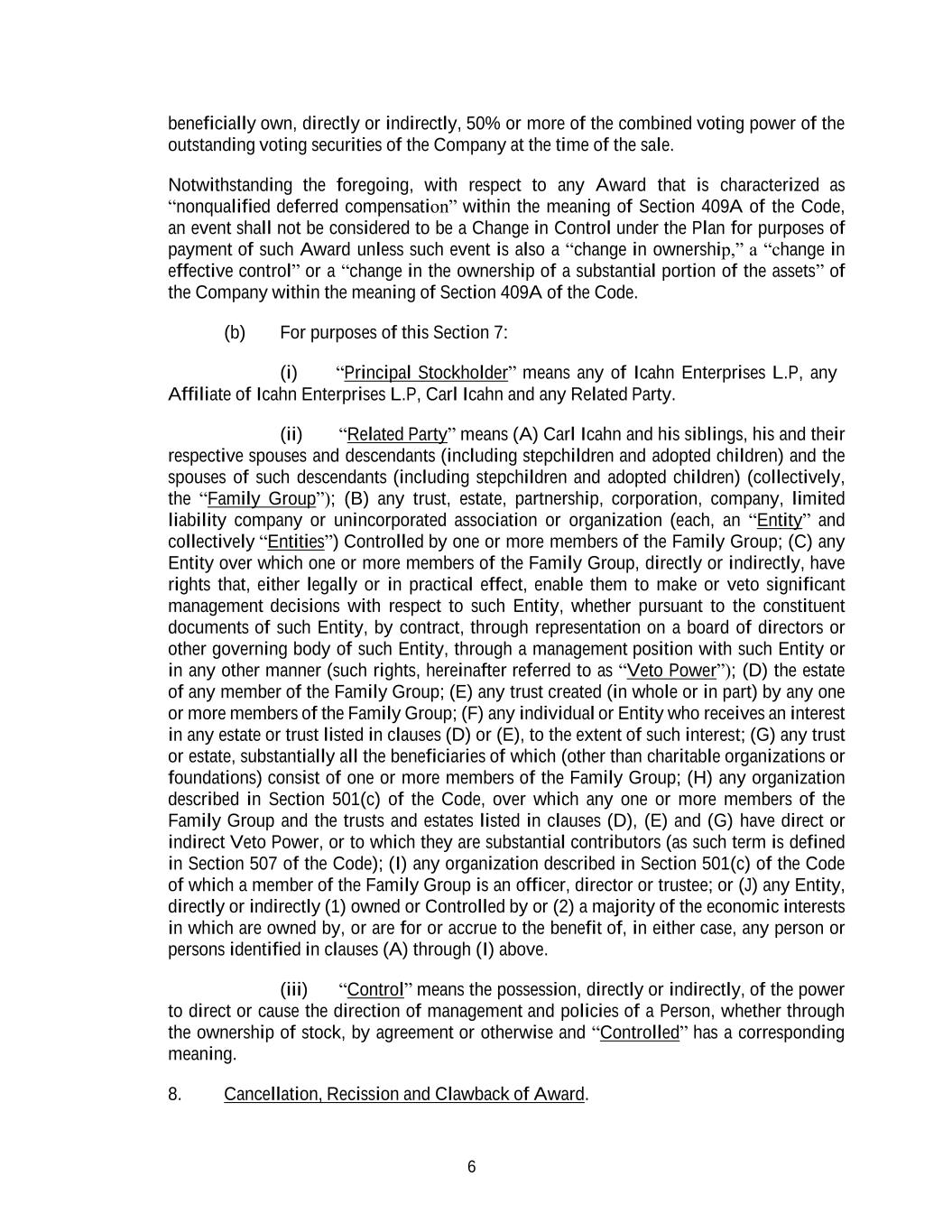 6 beneficially own, directly or indirectly, 50% or more of the combined voting power of the outstanding voting securities of the Company at the time of the sale. Notwithstanding the foregoing, with respect to any Award that is characterized as “nonqualified deferred compensation” within the meaning of Section 409A of the Code, an event shall not be considered to be a Change in Control under the Plan for purposes of payment of such Award unless such event is also a “change in ownership,” a “change in effective control” or a “change in the ownership of a substantial portion of the assets” of the Company within the meaning of Section 409A of the Code. (b) For purposes of this Section 7: (i) “Principal Stockholder” means any of Icahn Enterprises L.P, any Affiliate of Icahn Enterprises L.P, Carl Icahn and any Related Party. (ii) “Related Party” means (A) Carl Icahn and his siblings, his and their respective spouses and descendants (including stepchildren and adopted children) and the spouses of such descendants (including stepchildren and adopted children) (collectively, the “Family Group”); (B) any trust, estate, partnership, corporation, company, limited liability company or unincorporated association or organization (each, an “Entity” and collectively “Entities”) Controlled by one or more members of the Family Group; (C) any Entity over which one or more members of the Family Group, directly or indirectly, have rights that, either legally or in practical effect, enable them to make or veto significant management decisions with respect to such Entity, whether pursuant to the constituent documents of such Entity, by contract, through representation on a board of directors or other governing body of such Entity, through a management position with such Entity or in any other manner (such rights, hereinafter referred to as “Veto Power”); (D) the estate of any member of the Family Group; (E) any trust created (in whole or in part) by any one or more members of the Family Group; (F) any individual or Entity who receives an interest in any estate or trust listed in clauses (D) or (E), to the extent of such interest; (G) any trust or estate, substantially all the beneficiaries of which (other than charitable organizations or foundations) consist of one or more members of the Family Group; (H) any organization described in Section 501(c) of the Code, over which any one or more members of the Family Group and the trusts and estates listed in clauses (D), (E) and (G) have direct or indirect Veto Power, or to which they are substantial contributors (as such term is defined in Section 507 of the Code); (I) any organization described in Section 501(c) of the Code of which a member of the Family Group is an officer, director or trustee; or (J) any Entity, directly or indirectly (1) owned or Controlled by or (2) a majority of the economic interests in which are owned by, or are for or accrue to the benefit of, in either case, any person or persons identified in clauses (A) through (I) above. (iii) “Control” means the possession, directly or indirectly, of the power to direct or cause the direction of management and policies of a Person, whether through the ownership of stock, by agreement or otherwise and “Controlled” has a corresponding meaning. 8. Cancellation, Recission and Clawback of Award.