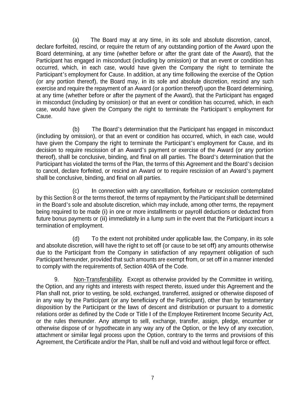 7 (a) The Board may at any time, in its sole and absolute discretion, cancel, declare forfeited, rescind, or require the return of any outstanding portion of the Award upon the Board determining, at any time (whether before or after the grant date of the Award), that the Participant has engaged in misconduct (including by omission) or that an event or condition has occurred, which, in each case, would have given the Company the right to terminate the Participant’s employment for Cause. In addition, at any time following the exercise of the Option (or any portion thereof), the Board may, in its sole and absolute discretion, rescind any such exercise and require the repayment of an Award (or a portion thereof) upon the Board determining, at any time (whether before or after the payment of the Award), that the Participant has engaged in misconduct (including by omission) or that an event or condition has occurred, which, in each case, would have given the Company the right to terminate the Participant’s employment for Cause. (b) The Board’s determination that the Participant has engaged in misconduct (including by omission), or that an event or condition has occurred, which, in each case, would have given the Company the right to terminate the Participant’s employment for Cause, and its decision to require rescission of an Award’s payment or exercise of the Award (or any portion thereof), shall be conclusive, binding, and final on all parties. The Board’s determination that the Participant has violated the terms of the Plan, the terms of this Agreement and the Board’s decision to cancel, declare forfeited, or rescind an Award or to require rescission of an Award’s payment shall be conclusive, binding, and final on all parties. (c) In connection with any cancellation, forfeiture or rescission contemplated by this Section 8 or the terms thereof, the terms of repayment by the Participant shall be determined in the Board’s sole and absolute discretion, which may include, among other terms, the repayment being required to be made (i) in one or more installments or payroll deductions or deducted from future bonus payments or (ii) immediately in a lump sum in the event that the Participant incurs a termination of employment. (d) To the extent not prohibited under applicable law, the Company, in its sole and absolute discretion, will have the right to set off (or cause to be set off) any amounts otherwise due to the Participant from the Company in satisfaction of any repayment obligation of such Participant hereunder, provided that such amounts are exempt from, or set off in a manner intended to comply with the requirements of, Section 409A of the Code. 9. Non-Transferability. Except as otherwise provided by the Committee in writing, the Option, and any rights and interests with respect thereto, issued under this Agreement and the Plan shall not, prior to vesting, be sold, exchanged, transferred, assigned or otherwise disposed of in any way by the Participant (or any beneficiary of the Participant), other than by testamentary disposition by the Participant or the laws of descent and distribution or pursuant to a domestic relations order as defined by the Code or Title I of the Employee Retirement Income Security Act, or the rules thereunder. Any attempt to sell, exchange, transfer, assign, pledge, encumber or otherwise dispose of or hypothecate in any way any of the Option, or the levy of any execution, attachment or similar legal process upon the Option, contrary to the terms and provisions of this Agreement, the Certificate and/or the Plan, shall be null and void and without legal force or effect.