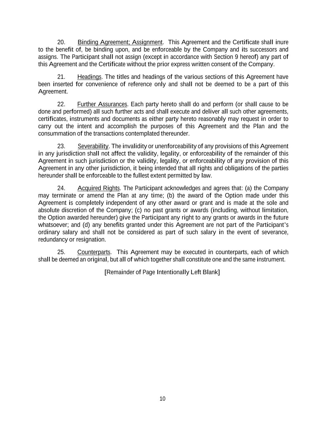 10 20. Binding Agreement; Assignment. This Agreement and the Certificate shall inure to the benefit of, be binding upon, and be enforceable by the Company and its successors and assigns. The Participant shall not assign (except in accordance with Section 9 hereof) any part of this Agreement and the Certificate without the prior express written consent of the Company. 21. Headings. The titles and headings of the various sections of this Agreement have been inserted for convenience of reference only and shall not be deemed to be a part of this Agreement. 22. Further Assurances. Each party hereto shall do and perform (or shall cause to be done and performed) all such further acts and shall execute and deliver all such other agreements, certificates, instruments and documents as either party hereto reasonably may request in order to carry out the intent and accomplish the purposes of this Agreement and the Plan and the consummation of the transactions contemplated thereunder. 23. Severability. The invalidity or unenforceability of any provisions of this Agreement in any jurisdiction shall not affect the validity, legality, or enforceability of the remainder of this Agreement in such jurisdiction or the validity, legality, or enforceability of any provision of this Agreement in any other jurisdiction, it being intended that all rights and obligations of the parties hereunder shall be enforceable to the fullest extent permitted by law. 24. Acquired Rights. The Participant acknowledges and agrees that: (a) the Company may terminate or amend the Plan at any time; (b) the award of the Option made under this Agreement is completely independent of any other award or grant and is made at the sole and absolute discretion of the Company; (c) no past grants or awards (including, without limitation, the Option awarded hereunder) give the Participant any right to any grants or awards in the future whatsoever; and (d) any benefits granted under this Agreement are not part of the Participant’s ordinary salary and shall not be considered as part of such salary in the event of severance, redundancy or resignation. 25. Counterparts. This Agreement may be executed in counterparts, each of which shall be deemed an original, but all of which together shall constitute one and the same instrument. [Remainder of Page Intentionally Left Blank]
