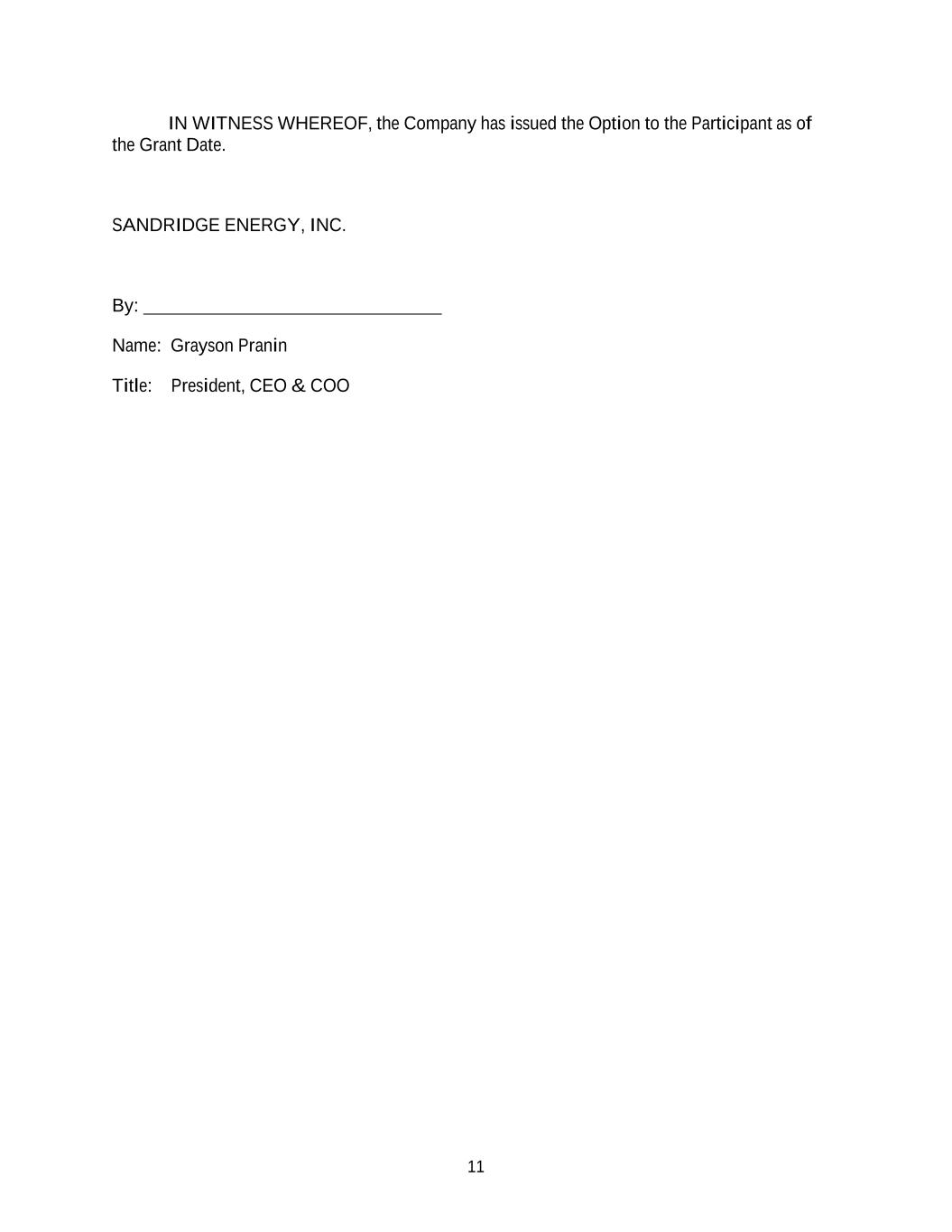 11 IN WITNESS WHEREOF, the Company has issued the Option to the Participant as of the Grant Date. SANDRIDGE ENERGY, INC. By: Name: Grayson Pranin Title: President, CEO & COO