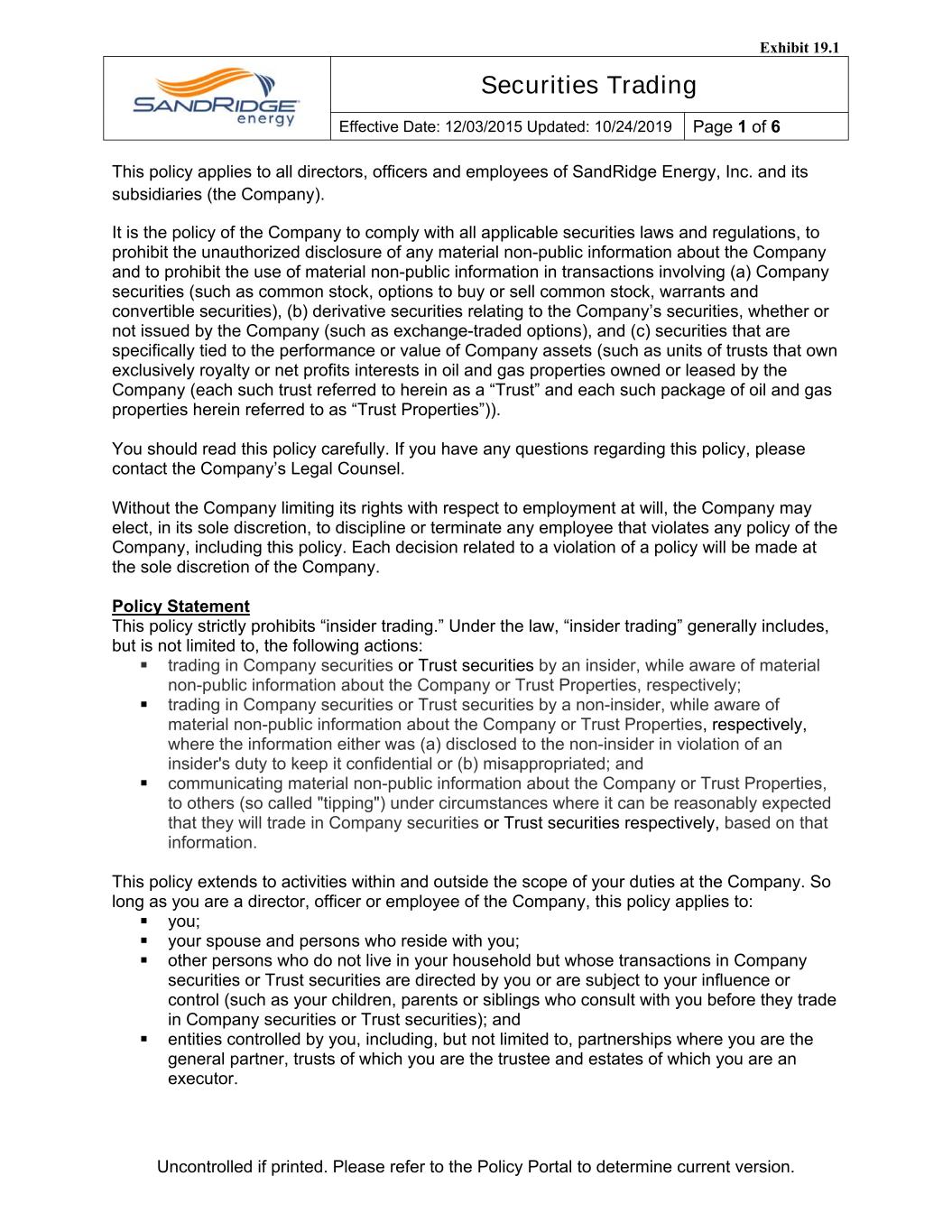 Securities Trading Effective Date: 12/03/2015 Updated: 10/24/2019 Page 1 of 6 Uncontrolled if printed. Please refer to the Policy Portal to determine current version. This policy applies to all directors, officers and employees of SandRidge Energy, Inc. and its subsidiaries (the Company). It is the policy of the Company to comply with all applicable securities laws and regulations, to prohibit the unauthorized disclosure of any material non-public information about the Company and to prohibit the use of material non-public information in transactions involving (a) Company securities (such as common stock, options to buy or sell common stock, warrants and convertible securities), (b) derivative securities relating to the Company’s securities, whether or not issued by the Company (such as exchange-traded options), and (c) securities that are specifically tied to the performance or value of Company assets (such as units of trusts that own exclusively royalty or net profits interests in oil and gas properties owned or leased by the Company (each such trust referred to herein as a “Trust” and each such package of oil and gas properties herein referred to as “Trust Properties”)). You should read this policy carefully. If you have any questions regarding this policy, please contact the Company’s Legal Counsel. Without the Company limiting its rights with respect to employment at will, the Company may elect, in its sole discretion, to discipline or terminate any employee that violates any policy of the Company, including this policy. Each decision related to a violation of a policy will be made at the sole discretion of the Company. Policy Statement This policy strictly prohibits “insider trading.” Under the law, “insider trading” generally includes, but is not limited to, the following actions: trading in Company securities or Trust securities by an insider, while aware of material non-public information about the Company or Trust Properties, respectively; trading in Company securities or Trust securities by a non-insider, while aware of material non-public information about the Company or Trust Properties, respectively, where the information either was (a) disclosed to the non-insider in violation of an insider's duty to keep it confidential or (b) misappropriated; and communicating material non-public information about the Company or Trust Properties, to others (so called "tipping") under circumstances where it can be reasonably expected that they will trade in Company securities or Trust securities respectively, based on that information. This policy extends to activities within and outside the scope of your duties at the Company. So long as you are a director, officer or employee of the Company, this policy applies to: you; your spouse and persons who reside with you; other persons who do not live in your household but whose transactions in Company securities or Trust securities are directed by you or are subject to your influence or control (such as your children, parents or siblings who consult with you before they trade in Company securities or Trust securities); and entities controlled by you, including, but not limited to, partnerships where you are the general partner, trusts of which you are the trustee and estates of which you are an executor. Exhibit 19.1