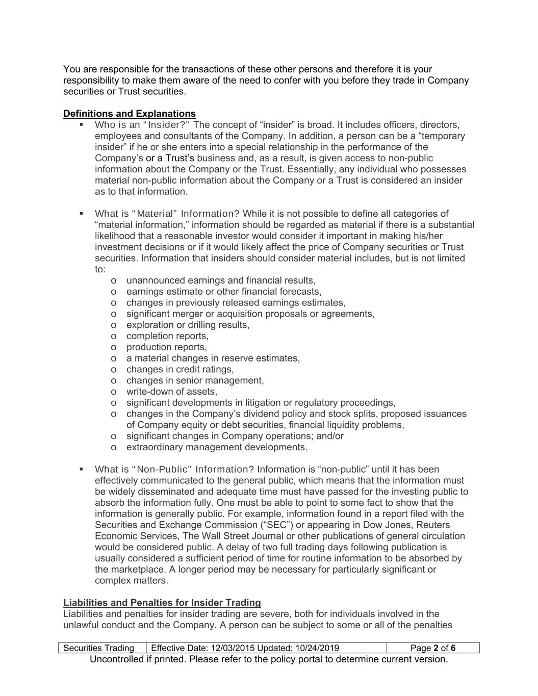 Securities Trading Effective Date: 12/03/2015 Updated: 10/24/2019 Page 2 of 6 Uncontrolled if printed. Please refer to the policy portal to determine current version. You are responsible for the transactions of these other persons and therefore it is your responsibility to make them aware of the need to confer with you before they trade in Company securities or Trust securities. Definitions and Explanations Who is an “Insider?” The concept of “insider” is broad. It includes officers, directors, employees and consultants of the Company. In addition, a person can be a “temporary insider” if he or she enters into a special relationship in the performance of the Company’s or a Trust’s business and, as a result, is given access to non-public information about the Company or the Trust. Essentially, any individual who possesses material non-public information about the Company or a Trust is considered an insider as to that information. What is “Material” Information? While it is not possible to define all categories of “material information,” information should be regarded as material if there is a substantial likelihood that a reasonable investor would consider it important in making his/her investment decisions or if it would likely affect the price of Company securities or Trust securities. Information that insiders should consider material includes, but is not limited to: o unannounced earnings and financial results, o earnings estimate or other financial forecasts, o changes in previously released earnings estimates, o significant merger or acquisition proposals or agreements, o exploration or drilling results, o completion reports, o production reports, o a material changes in reserve estimates, o changes in credit ratings, o changes in senior management, o write-down of assets, o significant developments in litigation or regulatory proceedings, o changes in the Company’s dividend policy and stock splits, proposed issuances of Company equity or debt securities, financial liquidity problems, o significant changes in Company operations; and/or o extraordinary management developments. What is “Non-Public” Information? Information is “non-public” until it has been effectively communicated to the general public, which means that the information must be widely disseminated and adequate time must have passed for the investing public to absorb the information fully. One must be able to point to some fact to show that the information is generally public. For example, information found in a report filed with the Securities and Exchange Commission (“SEC”) or appearing in Dow Jones, Reuters Economic Services, The Wall Street Journal or other publications of general circulation would be considered public. A delay of two full trading days following publication is usually considered a sufficient period of time for routine information to be absorbed by the marketplace. A longer period may be necessary for particularly significant or complex matters. Liabilities and Penalties for Insider Trading Liabilities and penalties for insider trading are severe, both for individuals involved in the unlawful conduct and the Company. A person can be subject to some or all of the penalties
