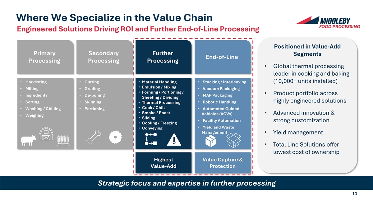 Where We Specialize in the Value Chain Engineered Solutions Driving ROI and Further End-of-Line Processing Positioned in Value-Add Primary Secondary Further Segments End-of-Line Processing Processing Processing • Global thermal processing leader in cooking and baking • Harvesting • Cutting • Material Handling • Stacking / Interleaving (10,000+ units installed) • Emulsion / Mixing • Milling • Grading • Vacuum Packaging • Forming / Portioning / • Product portfolio across • Ingredients • De-boning • MAP Packaging Sheeting / Dividing highly engineered solutions • Sorting • Skinning • Robotic Handling • Thermal Processing • Cook / Chill • Washing / Chilling• Portioning• Automated Guided • Smoke / Roast • Advanced innovation & Vehicles (AGVs) • Weighing • Slicing • Facility Automation strong customization • Cooling / Freezing • Yield and Waste • Conveying Management • Yield management • Total Line Solutions offer lowest cost of ownership Highest Value Capture & Value-Add Protection Strategic focus and expertise in further processing 10