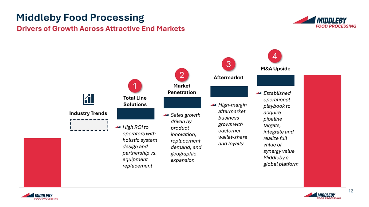 Favorable Industry Trends Shifting Dietary Demand Long-Term Advanced Increasing Elevating Preferences for for Local Underlying Automation Demand for Sustainability High Quality Food Security Consumption & Labor “Ready-to-Go” Goals Foods Growth Resilience Options Evolving consumer Geopolitical tensions Global labor shortages Expansion of the Modern equipment Consumer behavior prompting investments “consumer class” in focus on health and and rising unit labor reduces waste and has shifted towards in domestic production nutrition is driving a costs are driving need emerging markets is convenience-first and energy usage to meet structural shift towards infrastructure for increased increasing demand for sustainability targets on-the-go lifestyles protein-rich and efficiency and high-quality foods and lower costs nutrient-dense diets automation investment LSD to MSD $45B 2.1M $375B ~30% ~10% CAGR Projected Annual World Bank Unfilled Projected Global of Operating Costs Projected Growth of Growth in Global Commitment Manufacturing Market Size for in Food Global Nutritional Protein Consumption toward Advancing Positions Globally Ready-to-Eat Food by Manufacturing from Food Market 1 5 3 4 6 2 through 2030 Food Security by 2030 2032 (8.5% CAGR) Energy Expenses through 2032 1 4 Mordor Intelligence. FnF Research. 11 2 5 Data Bridge Market Research. World Bank. 3 6 National Association of Manufacturers. Brightpath Associates.