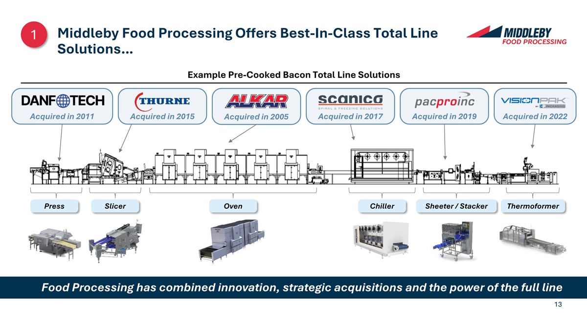 Middleby Food Processing Drivers of Growth Across Attractive End Markets 4 3 M&A Upside 2 Aftermarket Market 1 Penetration Established Total Line operational Solutions High-margin playbook to aftermarket acquire Industry Trends Sales growth business pipeline driven by grows with targets, High ROI to product customer integrate and operators with innovation, wallet-share realize full holistic system replacement and loyalty value of design and demand, and synergy value partnership vs. geographic Middleby’s equipment expansion global platform replacement 12 Industry Industry Leading Leading Platform Platform (current) (future)