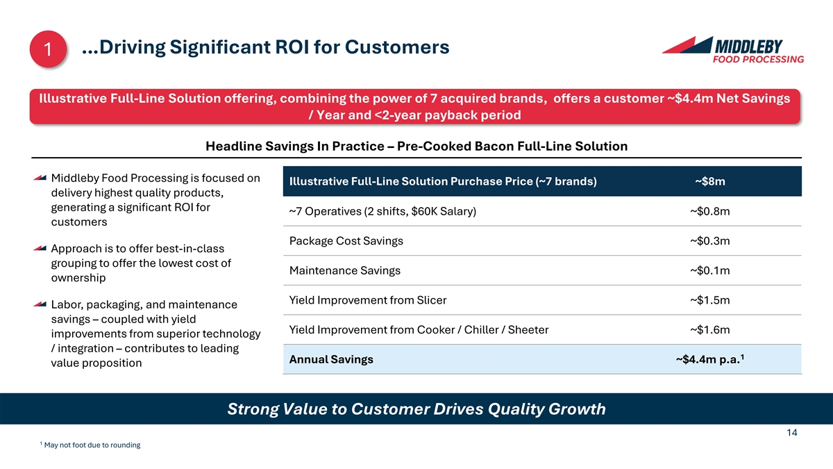 Middleby Food Processing Offers Best-In-Class Total Line 1 Solutions… Example Pre-Cooked Bacon Total Line Solutions Acquired in 2011 Acquired in 2015 Acquired in 2017 Acquired in 2019 Acquired in 2022 Acquired in 2005 Press Slicer Oven Chiller Sheeter / Stacker Thermoformer Food Processing has combined innovation, strategic acquisitions and the power of the full line 13