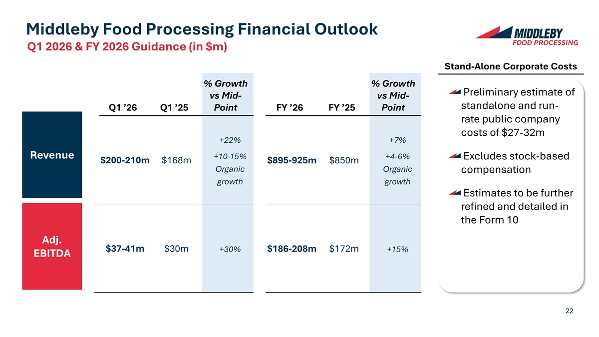Middleby Food Processing Financial Outlook Q1 2026 & FY 2026 Guidance (in $m) Stand-Alone Corporate Costs % Growth % Growth Preliminary estimate of vs Mid- vs Mid- standalone and run- Q1 ’26 Q1 ’25 Point FY ’26 FY ’25 Point rate public company costs of $27-32m +22% +7% Revenue +10-15% +4-6% Excludes stock-based $200-210m $168m $895-925m $850m Organic Organic compensation growth growth Estimates to be further refined and detailed in the Form 10 Adj. $37-41m $30m +30% $186-208m $172m +15% EBITDA 22