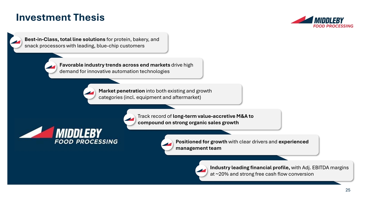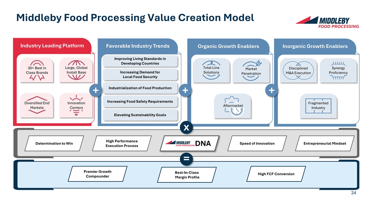 Middleby Food Processing Value Creation Model Industry Leading Platform Favorable Industry Trends Organic Growth Enablers Inorganic Growth Enablers Improving Living Standards in Developing Countries Large, Global Total Line 30+ Best in Synergy Disciplined Market Install Base Increasing Demand for Solutions Class Brands Proficiency M&A Execution Penetration Local Food Security Industrialization of Food Production + + + Increasing Food Safety Requirements Diversified End Innovation Fragmented Aftermarket Markets Centers Industry Elevating Sustainability Goals x High Performance Determination to Win Speed of Innovation Entrepreneurial Mindset DNA Execution Process = Premier Growth Best-In-Class High FCF Conversion Compounder Margin Profile 24