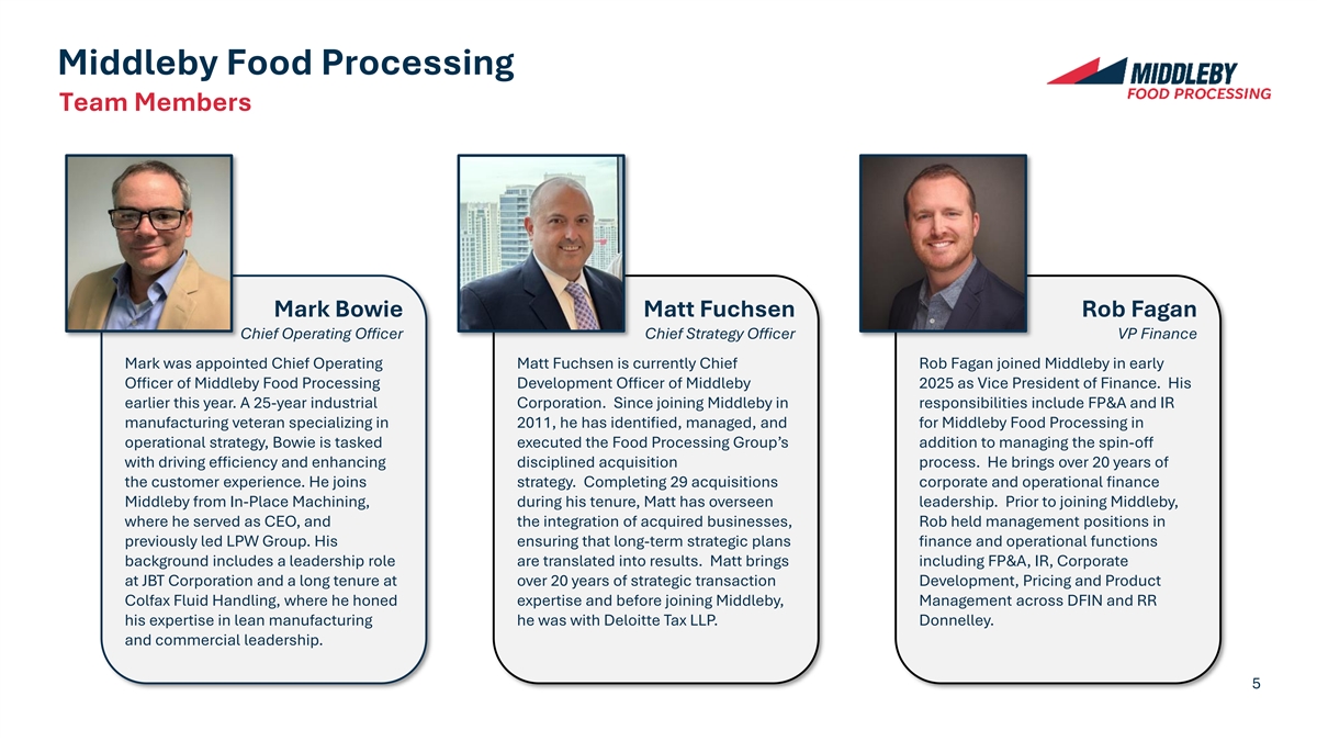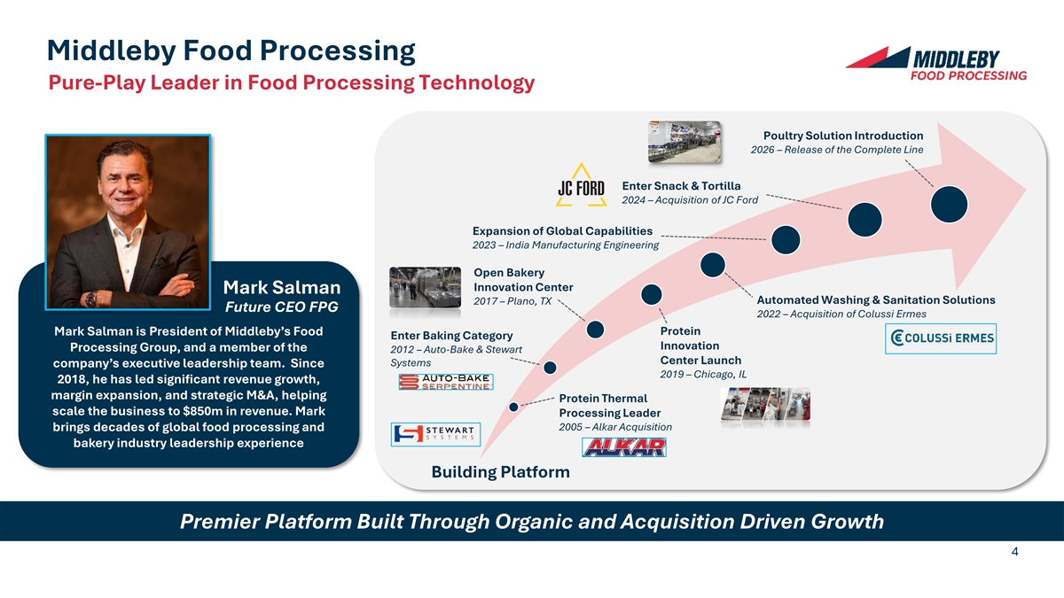 Middleby Food Processing Pure-Play Leader in Food Processing Technology Poultry Solution Introduction 2026 – Release of the Complete Line Enter Snack & Tortilla 2024 – Acquisition of JC Ford Expansion of Global Capabilities 2023 – India Manufacturing Engineering Open Bakery Innovation Center Mark Salman 2017 – Plano, TX Automated Washing & Sanitation Solutions Future CEO FPG 2022 – Acquisition of Colussi Ermes Mark Salman is President of Middleby’s Food Protein Enter Baking Category Innovation Processing Group, and a member of the 2012 – Auto-Bake & Stewart Center Launch Systems company’s executive leadership team. Since 2019 – Chicago, IL 2018, he has led significant revenue growth, margin expansion, and strategic M&A, helping Protein Thermal scale the business to $850m in revenue. Mark Processing Leader 2005 – Alkar Acquisition brings decades of global food processing and bakery industry leadership experience Building Platform Premier Platform Built Through Organic and Acquisition Driven Growth 4