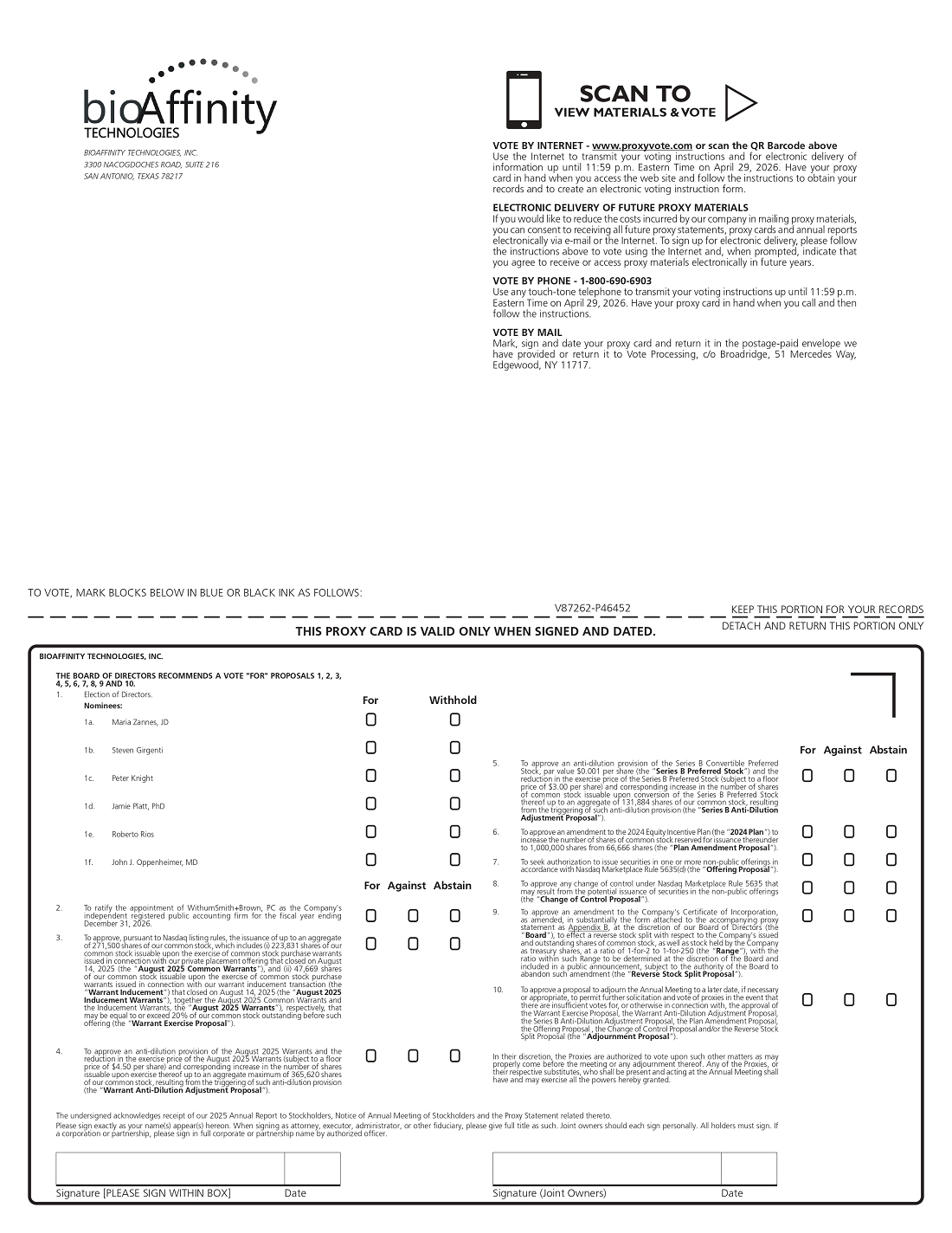 The Board of Directors (the “Board”) of bioAffinity Technologies, Inc., a Delaware corporation (the “Company”), is soliciting proxies to be used at the 2026 Annual Meeting of Stockholders to be held on Thursday, April 30, 2026, at 8:00 a.m. Central Time (the “Annual Meeting”) at the Company’s principal office at 3300 Nacogdoches Road, Suite 216, San Antonio, Texas 78217. This proxy statement (this “Proxy Statement”) and the 2025 Annual Report to Stockholders, which is not a part of our proxy solicitation materials, are posted on the internet at www.proxyvote.com, and the Notice of Internet Availability of Proxy Materials (the “Notice”) will be mailed to our stockholders on or about __________, 2026. If you previously requested electronic or paper delivery of the proxy materials, you will be sent this Proxy Statement, the accompanying proxy card, and the 2025 Annual Report to Stockholders on or about __________, 2026.